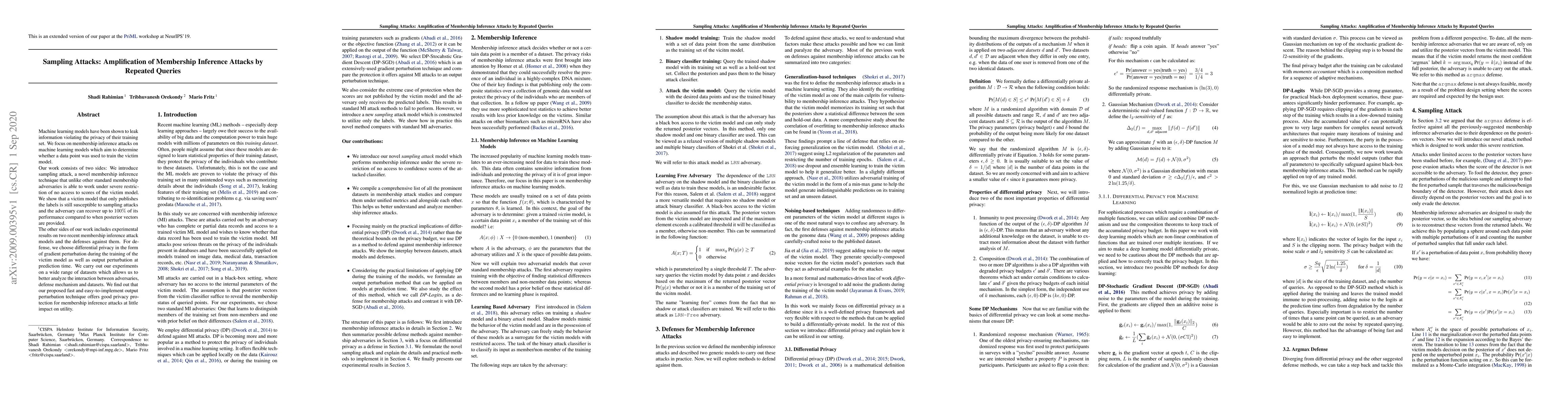 This paper introduces a novel membership inference attack technique called sampling attack, which can determine if data points were used to train a model without access to the model's scores. The authors demonstrate that even models publishing only labels are vulnerable, achieving up to 100% performance recovery. They also propose defenses using differential privacy, showing that output perturbation during predictions provides effective privacy protection with minimal utility impact.