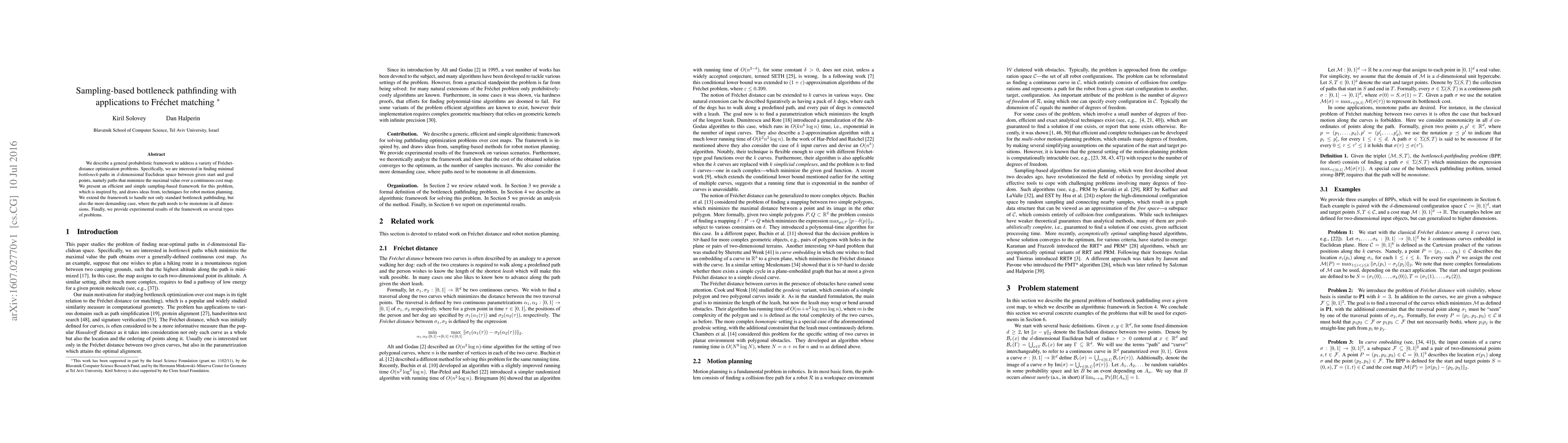 Researchers developed a probabilistic framework to find minimal bottleneck paths in Euclidean space between two points, applicable to Frechet matching problems, with efficient sampling-based methods for both standard and monotone pathfinding cases.