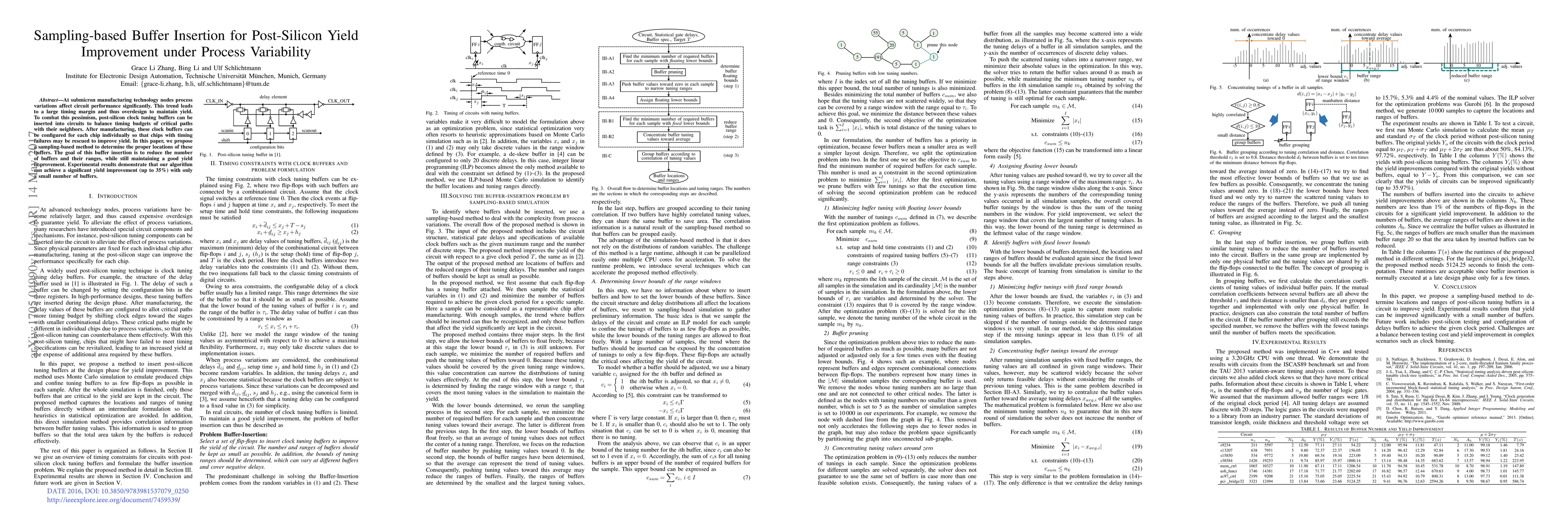 This paper proposes a sampling-based method for inserting post-silicon clock tuning buffers to improve yield under process variability, reducing overdesign while achieving up to a 35% yield improvement with minimal buffer usage. Experimental results show the method effectively balances timing budgets with fewer buffers.