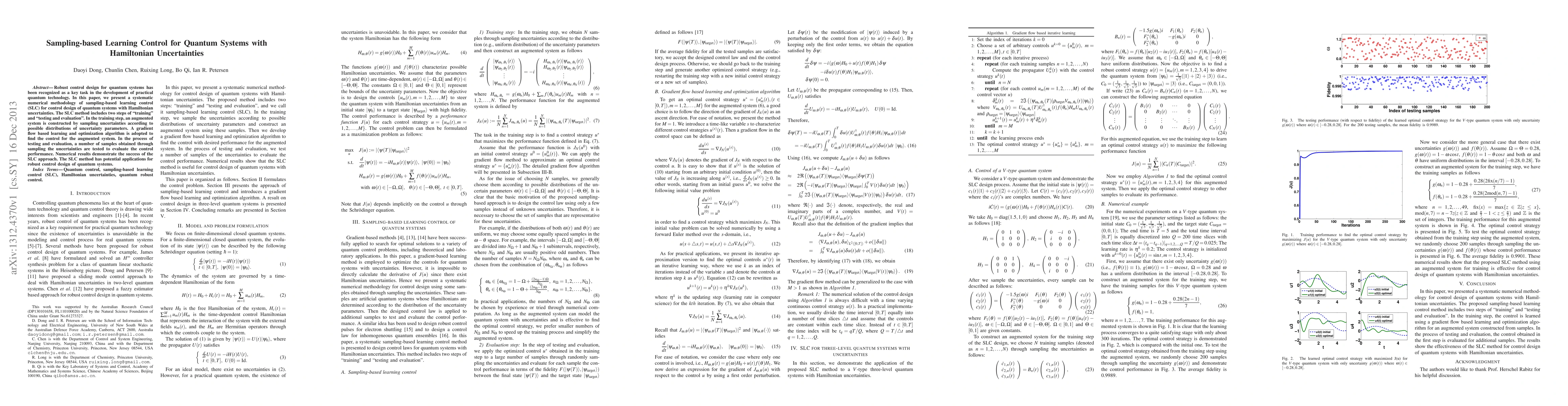 This paper introduces a sampling-based learning control (SLC) methodology for robust control design in quantum systems with Hamiltonian uncertainties. The SLC method involves training via augmented system construction and gradient flow optimization, followed by testing and evaluation of control performance.