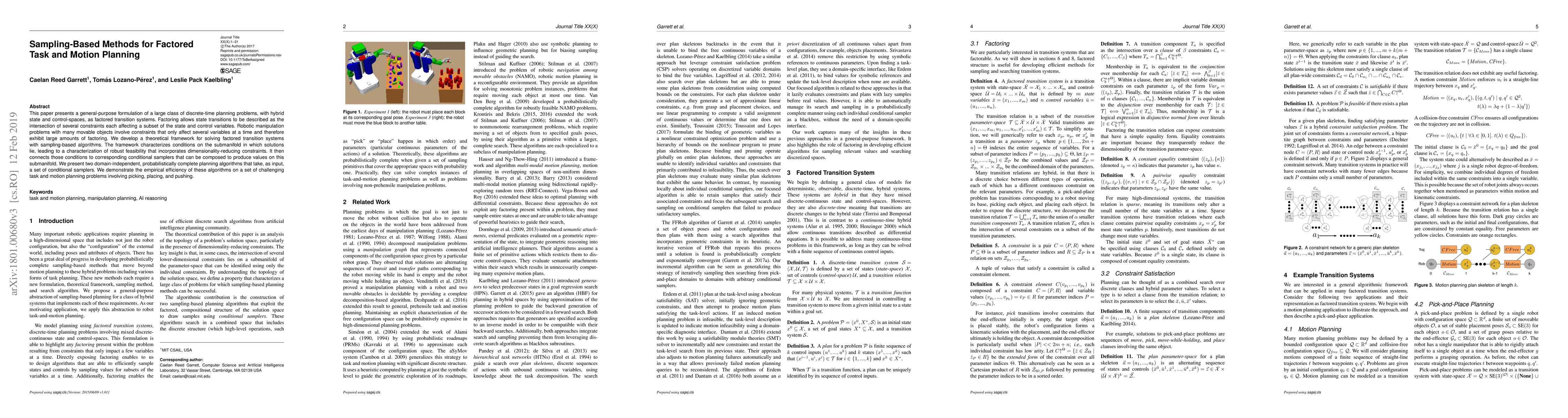 This paper introduces a theoretical framework for solving factored transition systems using sampling-based algorithms, focusing on robotic manipulation problems with multiple movable objects. It presents two domain-independent, probabilistically complete planning algorithms that leverage conditional samplers to efficiently solve complex task and motion planning problems.