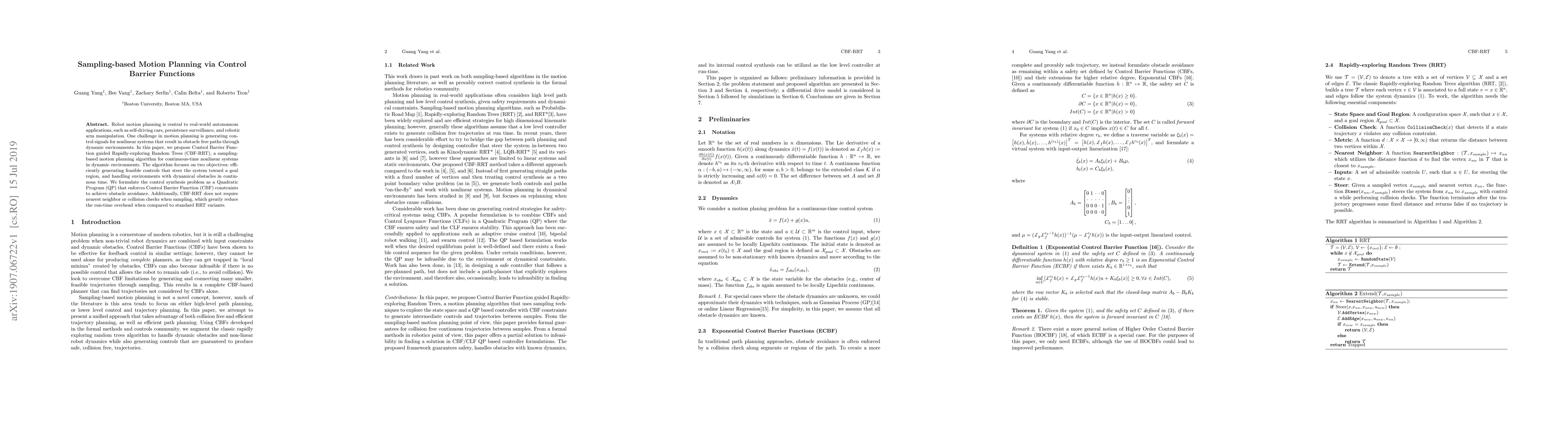 This paper introduces CBF-RRT, a sampling-based motion planning algorithm that uses Control Barrier Functions to generate obstacle-free paths for nonlinear systems in dynamic environments. The method efficiently synthesizes controls via a Quadratic Program, avoiding the need for collision checks during sampling.