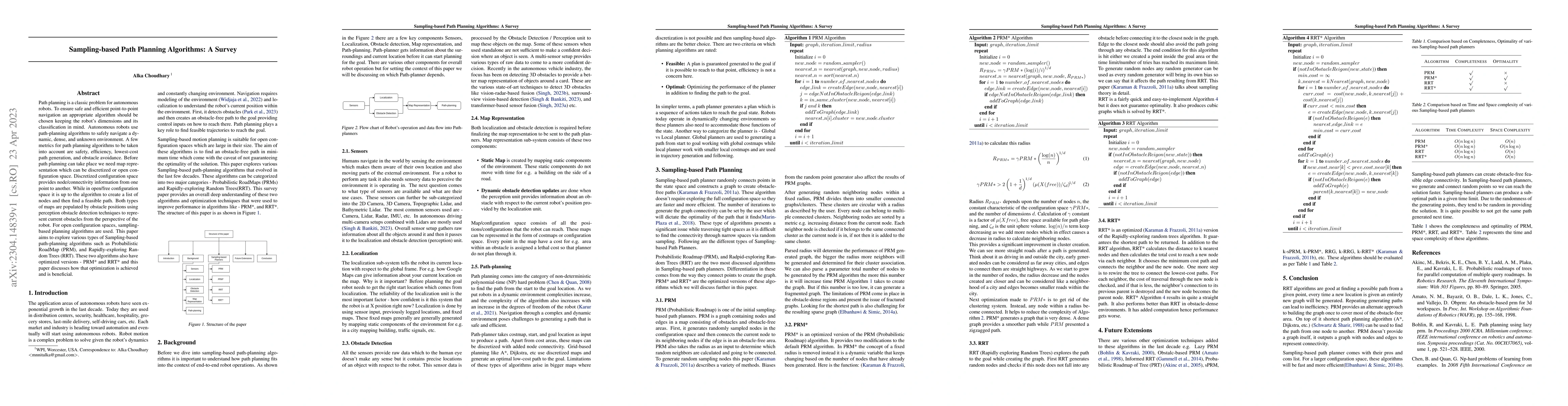 This paper surveys sampling-based path planning algorithms, focusing on Probabilistic RoadMap (PRM) and Rapidly-exploring Random Trees (RRT), and their optimized versions PRM* and RRT*. It discusses the advantages and optimizations of these algorithms for safe and efficient navigation in dynamic environments.