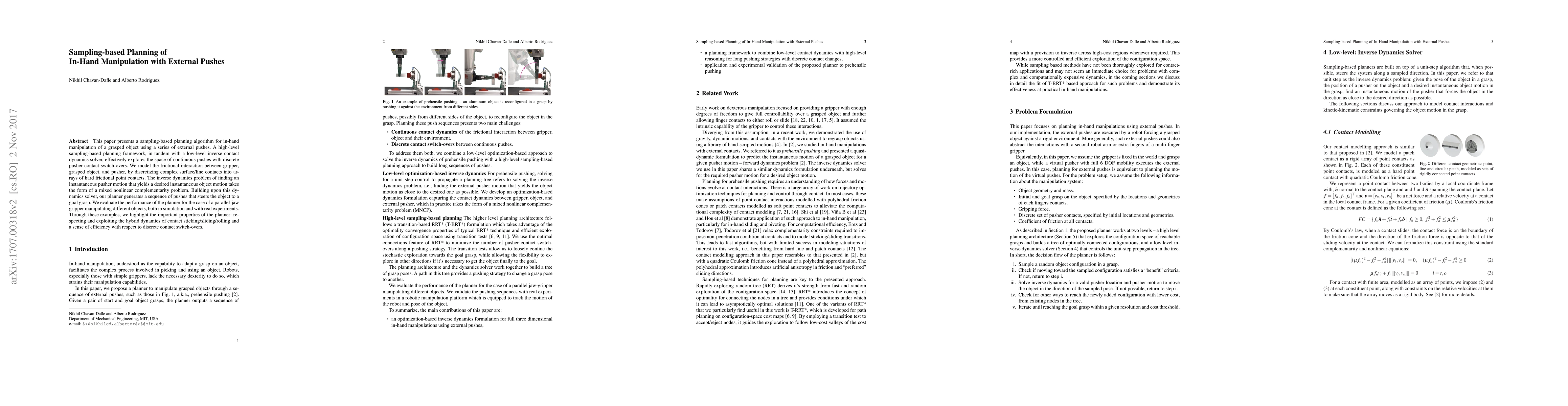 This paper introduces a sampling-based planning algorithm for in-hand manipulation using external pushes, combining high-level planning with low-level dynamics solving. The planner respects hybrid dynamics and efficiently navigates through discrete contact switch-overs, demonstrated through simulations and real-world experiments with a parallel-jaw gripper.