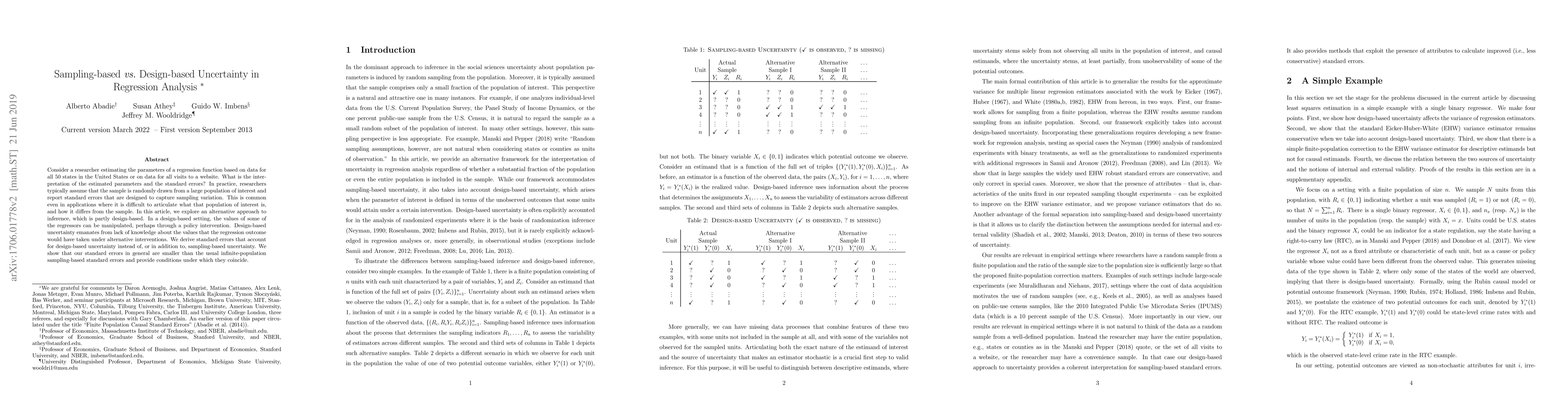 Consider a researcher estimating the parameters of a regression function based on data for all 50 states in the United States or on data for all visits to a website. What is the interpretation of the estimated parameters and the standard errors? In practice, researchers typically assume that the sample is randomly drawn from a large population of interest and report standard errors that are designed to capture sampling variation. This is common even in applications where it is difficult to articulate what that population of interest is, and how it differs from the sample. In this article, we explore an alternative approach to inference, which is partly design-based. In a design-based setting, the values of some of the regressors can be manipulated, perhaps through a policy intervention. Design-based uncertainty emanates from lack of knowledge about the values that the regression outcome would have taken under alternative interventions. We derive standard errors that account for design-based uncertainty instead of, or in addition to, sampling-based uncertainty. We show that our standard errors in general are smaller than the usual infinite-population sampling-based standard errors and provide conditions under which they coincide.