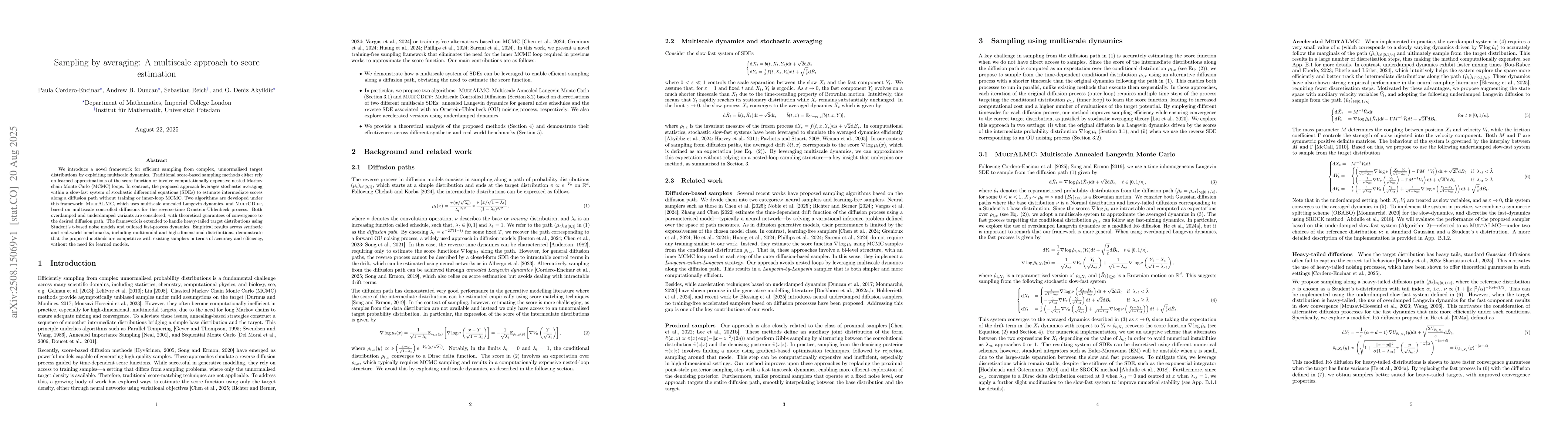 We introduce a novel framework for efficient sampling from complex, unnormalised target distributions by exploiting multiscale dynamics. Traditional score-based sampling methods either rely on learned approximations of the score function or involve computationally expensive nested Markov chain Monte Carlo (MCMC) loops. In contrast, the proposed approach leverages stochastic averaging within a slow-fast system of stochastic differential equations (SDEs) to estimate intermediate scores along a diffusion path without training or inner-loop MCMC. Two algorithms are developed under this framework: MultALMC, which uses multiscale annealed Langevin dynamics, and MultCDiff, based on multiscale controlled diffusions for the reverse-time Ornstein-Uhlenbeck process. Both overdamped and underdamped variants are considered, with theoretical guarantees of convergence to the desired diffusion path. The framework is extended to handle heavy-tailed target distributions using Student's t-based noise models and tailored fast-process dynamics. Empirical results across synthetic and real-world benchmarks, including multimodal and high-dimensional distributions, demonstrate that the proposed methods are competitive with existing samplers in terms of accuracy and efficiency, without the need for learned models.