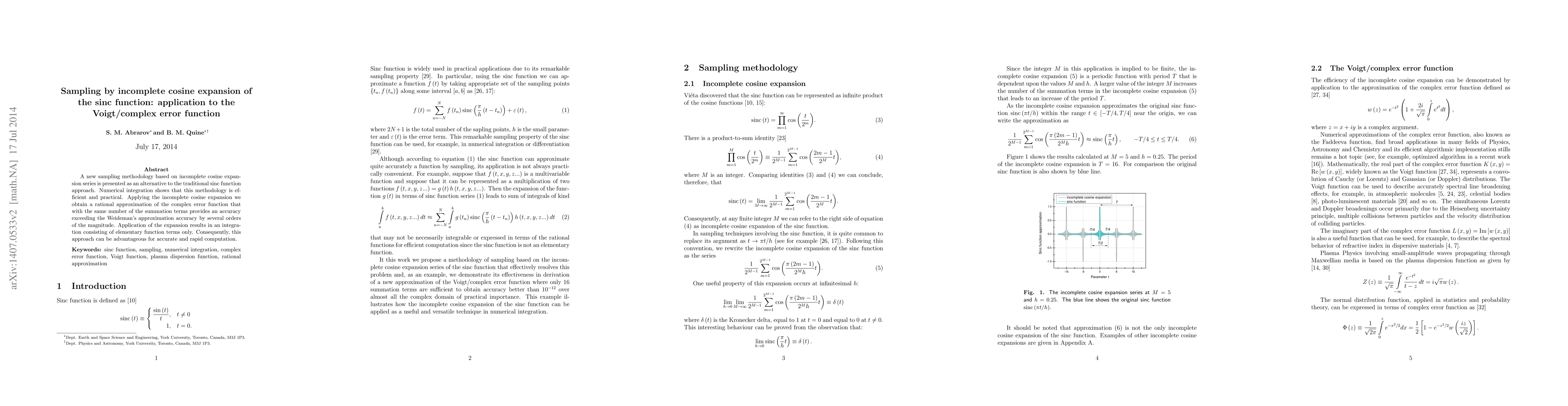 A new sampling methodology based on incomplete cosine expansion series is presented as an alternative to the traditional sinc function approach. Numerical integration shows that this methodology is efficient and practical. Applying the incomplete cosine expansion we obtain a rational approximation of the complex error function that with the same number of the summation terms provides an accuracy exceeding the Weideman\text{'}s approximation accuracy by several orders of the magnitude. Application of the expansion results in an integration consisting of elementary function terms only. Consequently, this approach can be advantageous for accurate and rapid computation.