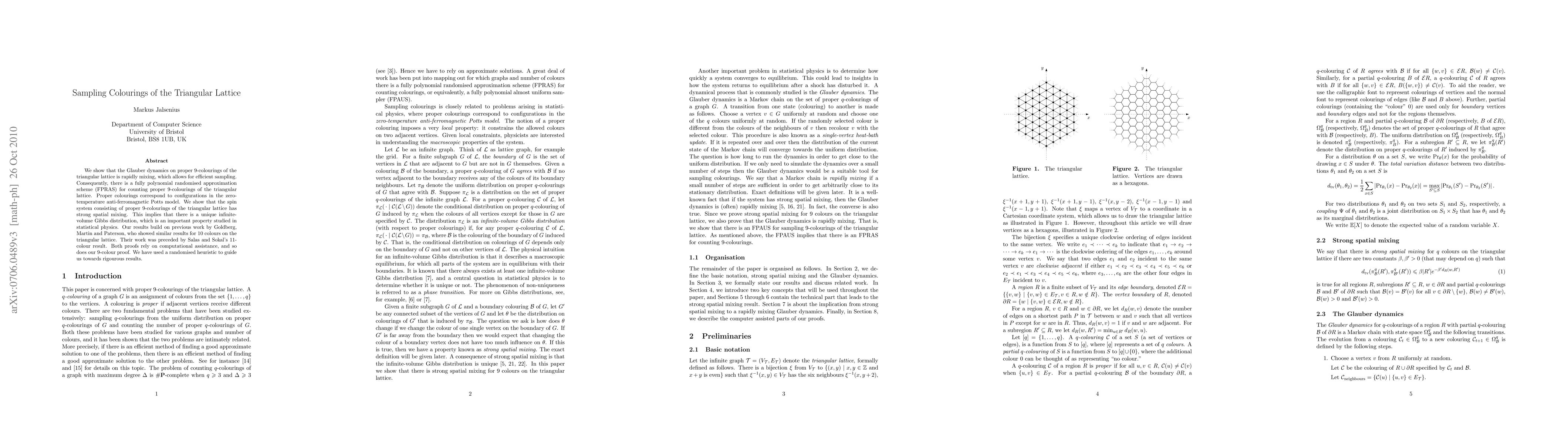 We show that the Glauber dynamics on proper 9-colourings of the triangular lattice is rapidly mixing, which allows for efficient sampling. Consequently, there is a fully polynomial randomised approximation scheme (FPRAS) for counting proper 9-colourings of the triangular lattice. Proper colourings correspond to configurations in the zero-temperature anti-ferromagnetic Potts model. We show that the spin system consisting of proper 9-colourings of the triangular lattice has strong spatial mixing. This implies that there is a unique infinite-volume Gibbs distribution, which is an important property studied in statistical physics. Our results build on previous work by Goldberg, Martin and Paterson, who showed similar results for 10 colours on the triangular lattice. Their work was preceded by Salas and Sokal's 11-colour result. Both proofs rely on computational assistance, and so does our 9-colour proof. We have used a randomised heuristic to guide us towards rigourous results.