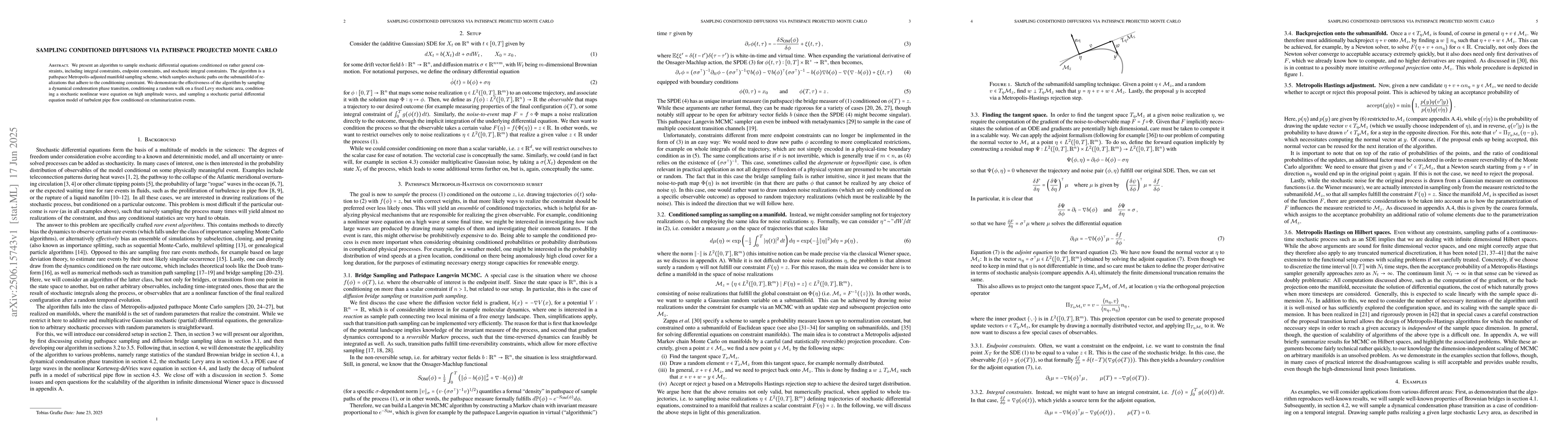 We present an algorithm to sample stochastic differential equations conditioned on rather general constraints, including integral constraints, endpoint constraints, and stochastic integral constraints. The algorithm is a pathspace Metropolis-adjusted manifold sampling scheme, which samples stochastic paths on the submanifold of realizations that adhere to the conditioning constraint. We demonstrate the effectiveness of the algorithm by sampling a dynamical condensation phase transition, conditioning a random walk on a fixed Levy stochastic area, conditioning a stochastic nonlinear wave equation on high amplitude waves, and sampling a stochastic partial differential equation model of turbulent pipe flow conditioned on relaminarization events.