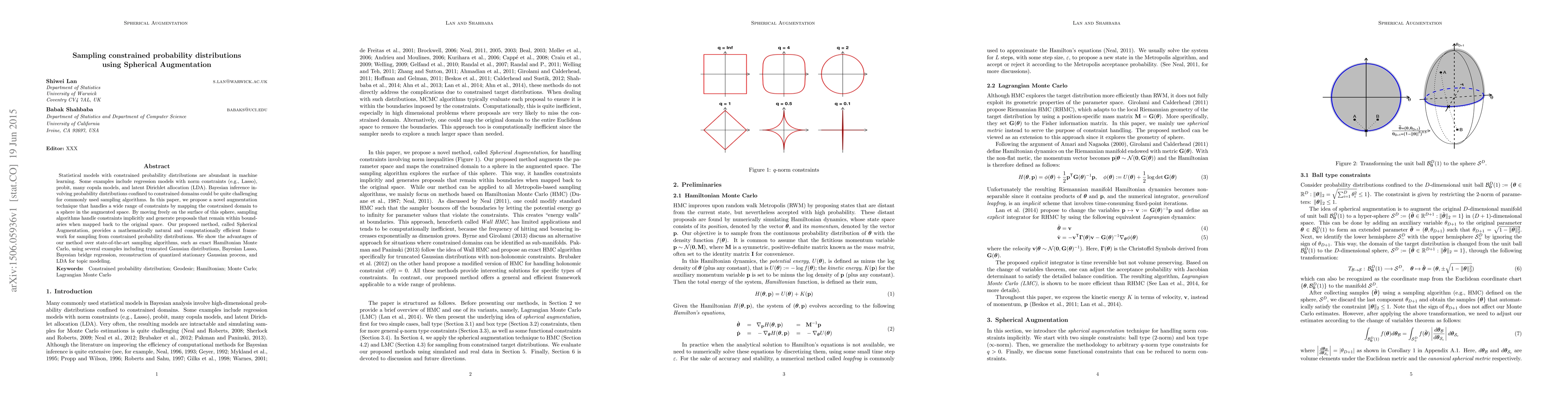 This paper introduces Spherical Augmentation, a novel technique to sample from constrained probability distributions by mapping them to a sphere in an augmented space, allowing sampling algorithms to handle constraints implicitly. The method is shown to outperform existing algorithms in various applications, including Bayesian Lasso and LDA for topic modeling.