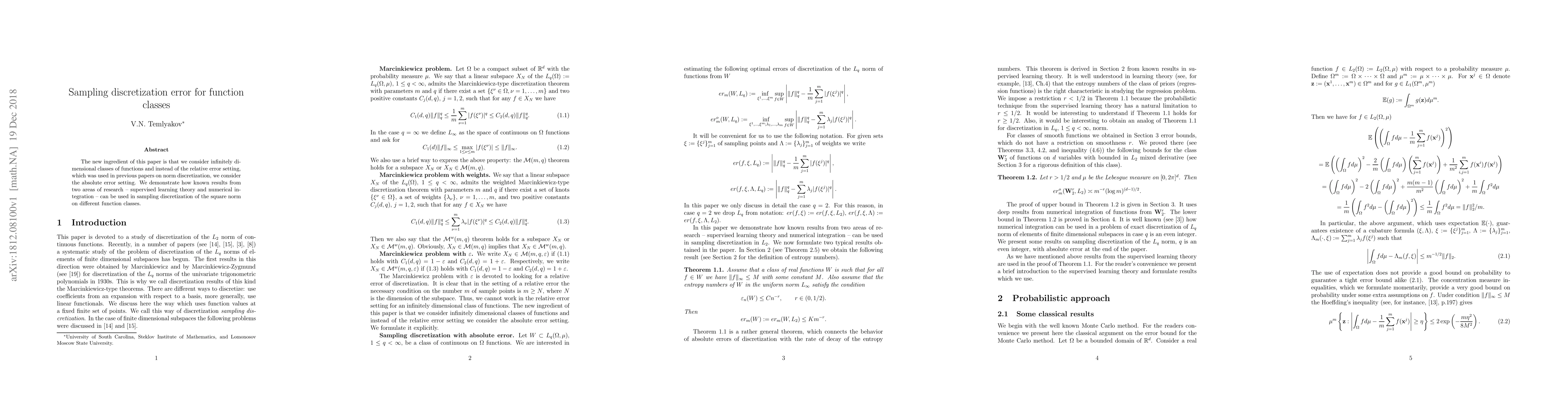 This paper explores the sampling discretization error for infinitely dimensional function classes, shifting from relative to absolute error settings. It integrates findings from supervised learning theory and numerical integration to demonstrate discretization of the square norm on various function classes.