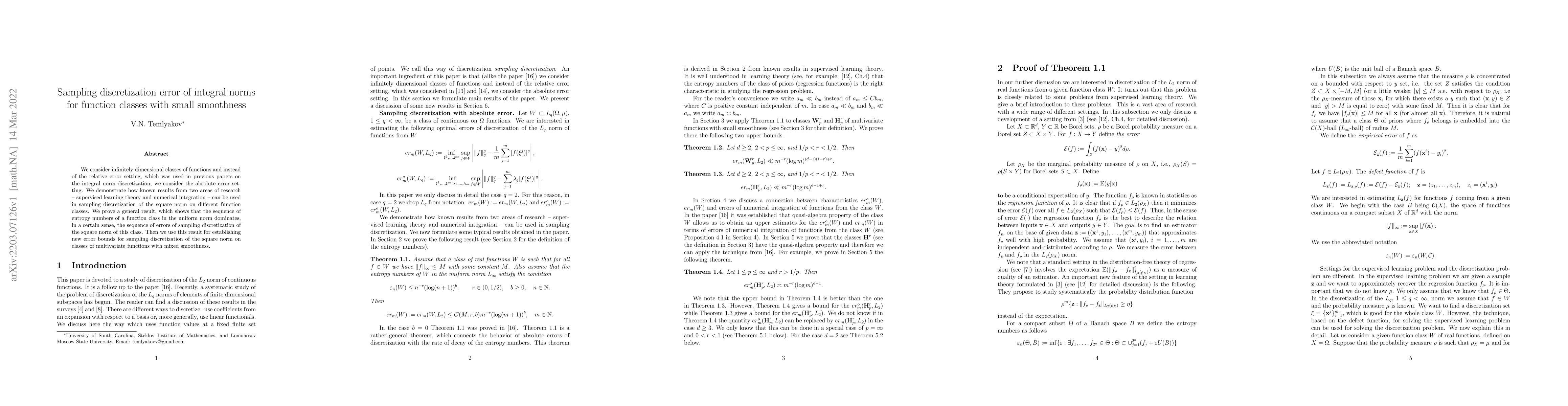 This paper investigates the absolute error in sampling discretization of integral norms for function classes with small smoothness, bridging supervised learning theory and numerical integration. It establishes a general result showing that the sequence of entropy numbers in the uniform norm governs the error in sampling discretization of the square norm, leading to new error bounds for multivariate functions with mixed smoothness.