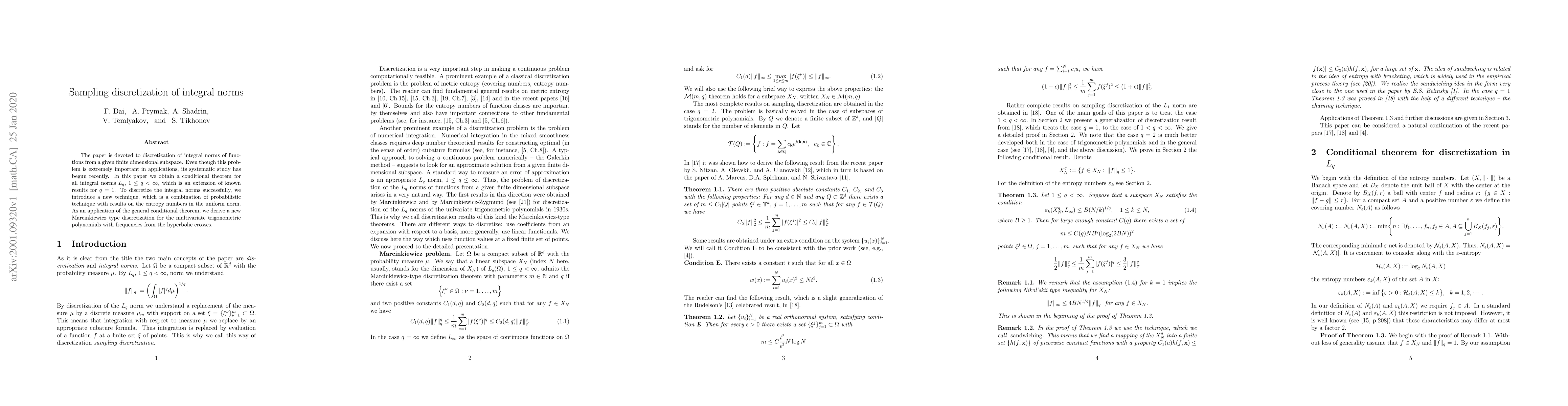 The paper is devoted to discretization of integral norms of functions from a given finite dimensional subspace. Even though this problem is extremely important in applications, its systematic study has begun recently. In this paper we obtain a conditional theorem for all integral norms $L_q$, $1\le q<\infty$, which is an extension of known results for $q=1$. To discretize the integral norms successfully, we introduce a new technique, which is a combination of probabilistic technique with results on the entropy numbers in the uniform norm. As an application of the general conditional theorem, we derive a new Marcinkiewicz type discretization for the multivariate trigonometric polynomials with frequencies from the hyperbolic crosses.