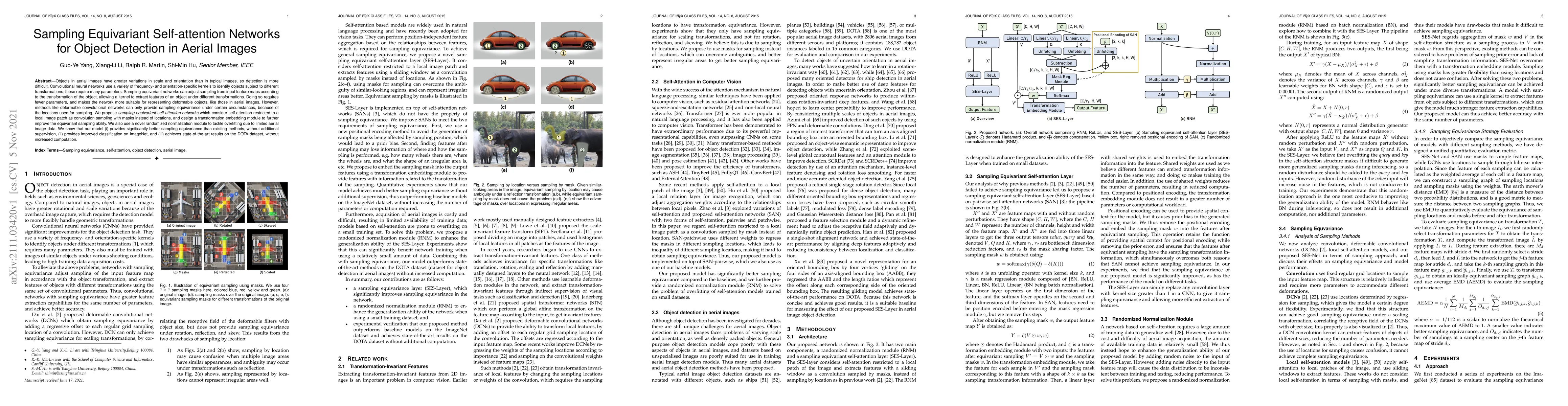 This paper proposes sampling equivariant self-attention networks for object detection in aerial images, achieving better sampling equivariance and state-of-the-art results on the DOTA dataset by using a transformation embedding module and a randomized normalization module to address overfitting.
