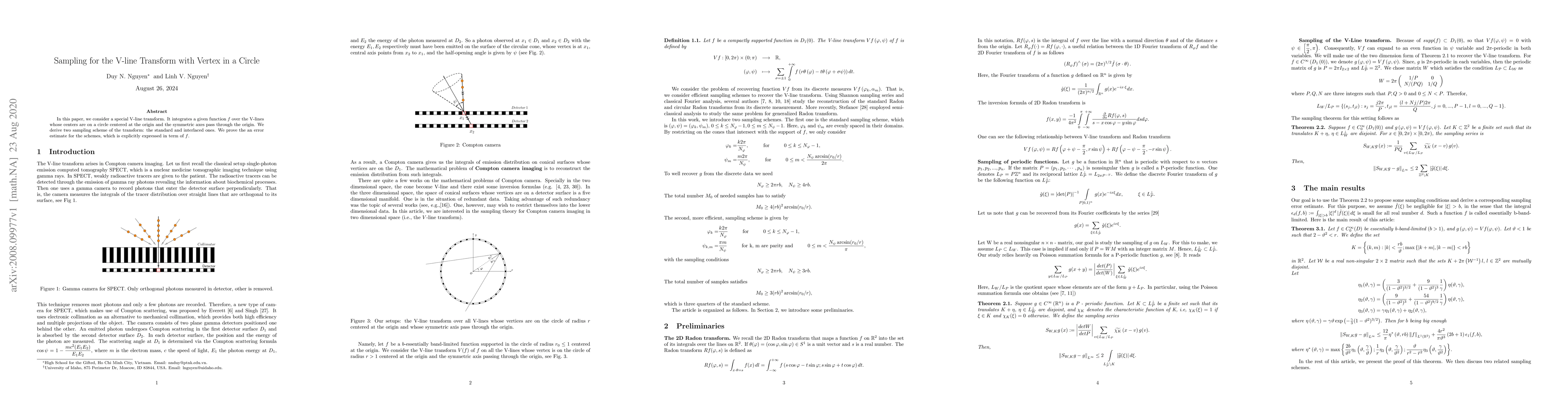 In this paper, we consider a special V-line transform. It integrates a given function f over the V-lines whose centers are on a circle centered at the origin and the symmetric axes pass through the origin. We derive two sampling scheme of the transform: the standard and interlaced ones. We prove the an error estimate for the schemes, which is explicitly expressed in term of f.