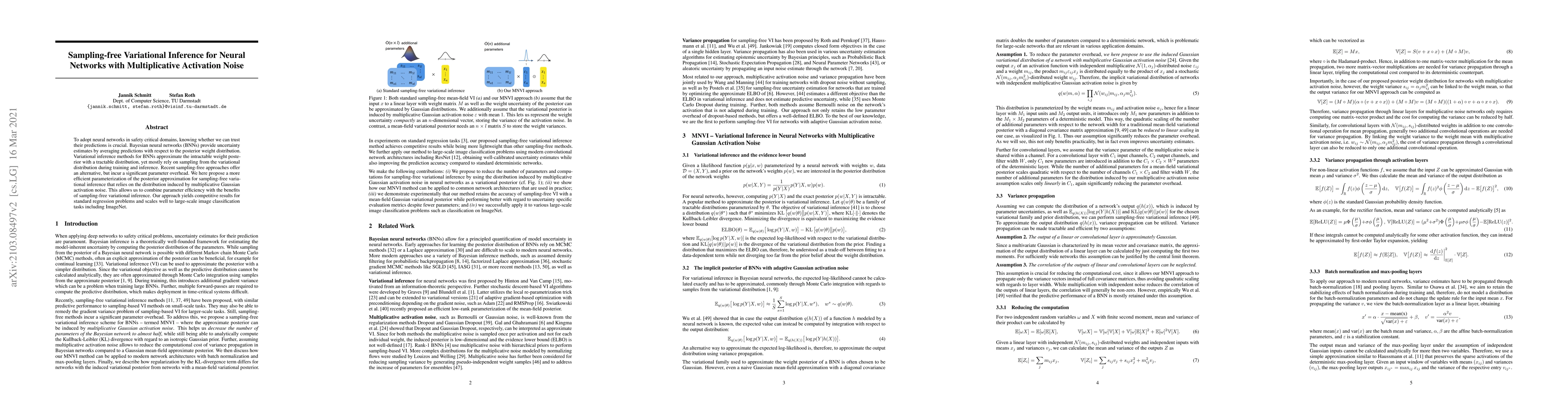 This paper proposes an efficient sampling-free variational inference method for Bayesian neural networks that leverages multiplicative Gaussian activation noise, achieving competitive performance in regression and large-scale image classification tasks like ImageNet. The approach balances parameter efficiency with the benefits of avoiding sampling during training and inference.
