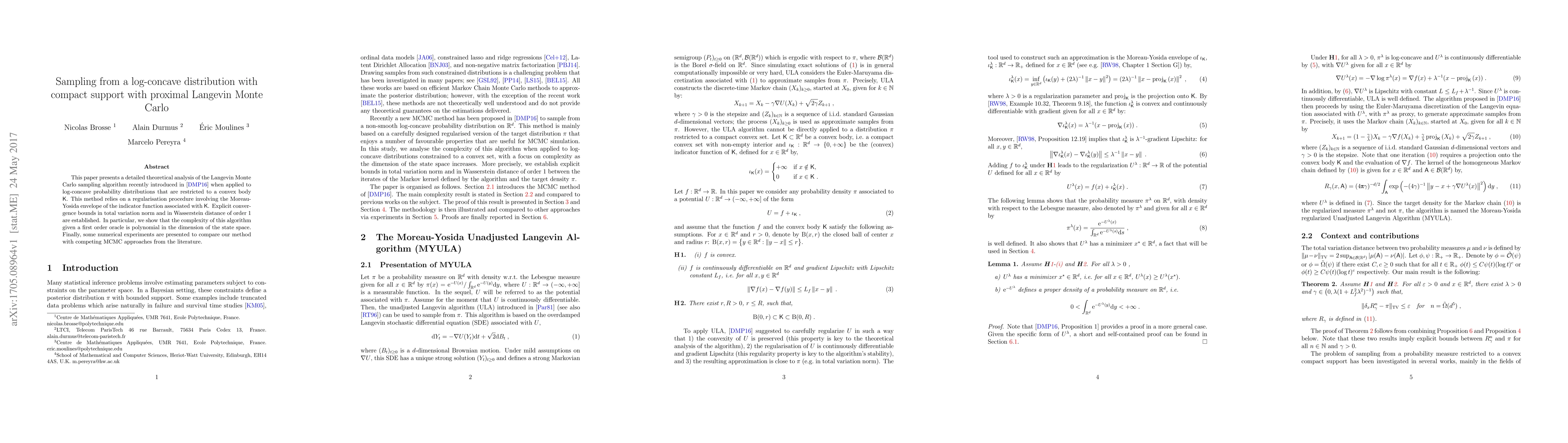 This paper analyzes the proximal Langevin Monte Carlo algorithm for sampling from log-concave distributions with compact support, providing theoretical convergence bounds and demonstrating polynomial complexity in the dimension. Numerical experiments compare its performance against other MCMC methods.