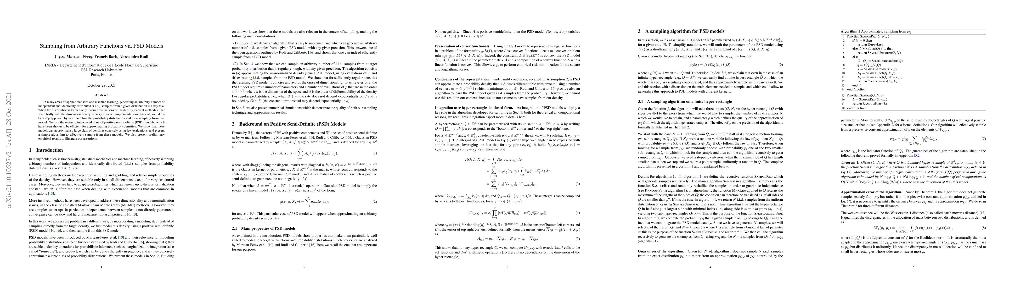 In many areas of applied statistics and machine learning, generating an arbitrary number of independent and identically distributed (i.i.d.) samples from a given distribution is a key task. When the distribution is known only through evaluations of the density, current methods either scale badly with the dimension or require very involved implementations. Instead, we take a two-step approach by first modeling the probability distribution and then sampling from that model. We use the recently introduced class of positive semi-definite (PSD) models, which have been shown to be efficient for approximating probability densities. We show that these models can approximate a large class of densities concisely using few evaluations, and present a simple algorithm to effectively sample from these models. We also present preliminary empirical results to illustrate our assertions.