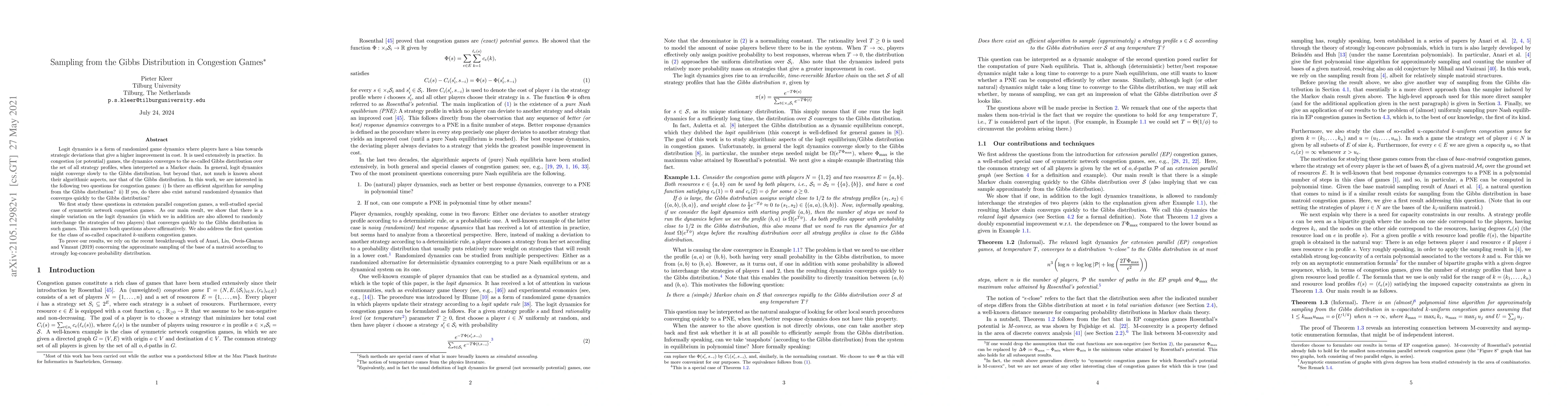 This paper investigates efficient algorithms for sampling from the Gibbs distribution in congestion games, particularly focusing on logit dynamics. It demonstrates that a modified logit dynamics method, allowing random interchange of strategies, efficiently converges to the Gibbs distribution in parallel congestion games, answering both posed questions affirmatively. The study also extends findings to capacitated $k$-uniform congestion games, leveraging recent advancements in matroid sampling.