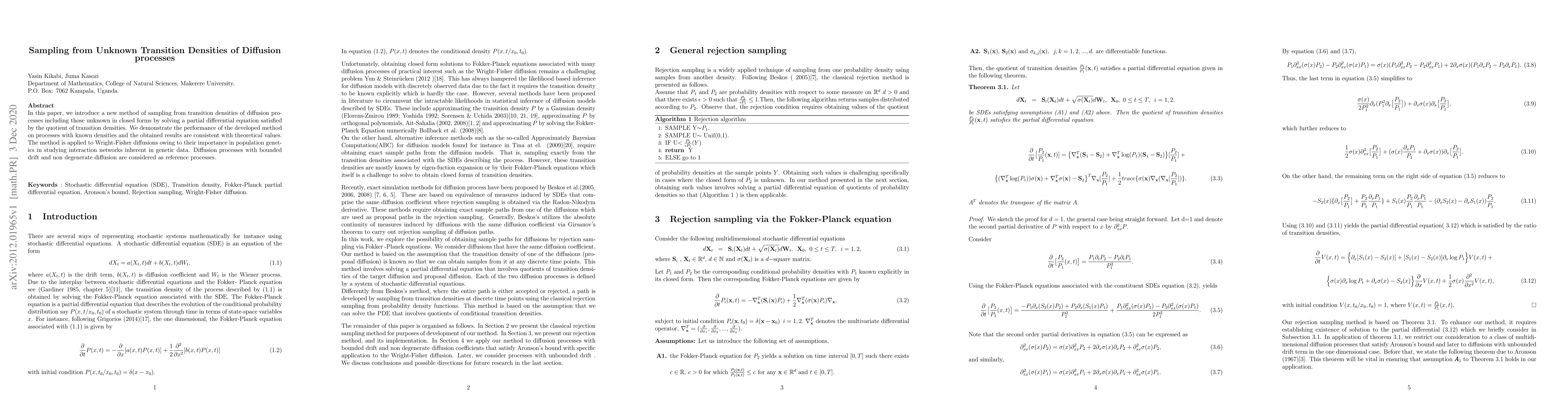 This paper presents a novel method for sampling from unknown transition densities of diffusion processes by solving a partial differential equation. The method is validated on known densities and applied to Wright-Fisher diffusions, highlighting its importance in population genetics for studying genetic interaction networks.