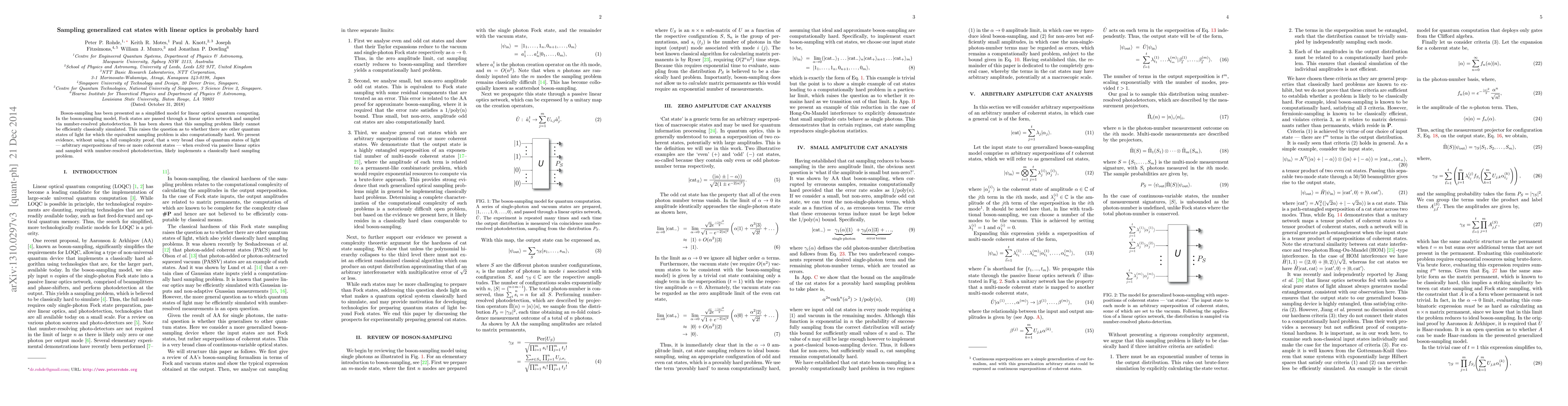 This paper suggests that sampling arbitrary superpositions of coherent states, evolved via linear optics and detected with number-resolved photons, is likely a classically hard problem. It provides evidence without a full complexity proof, implying potential significance for quantum computing with linear optics.