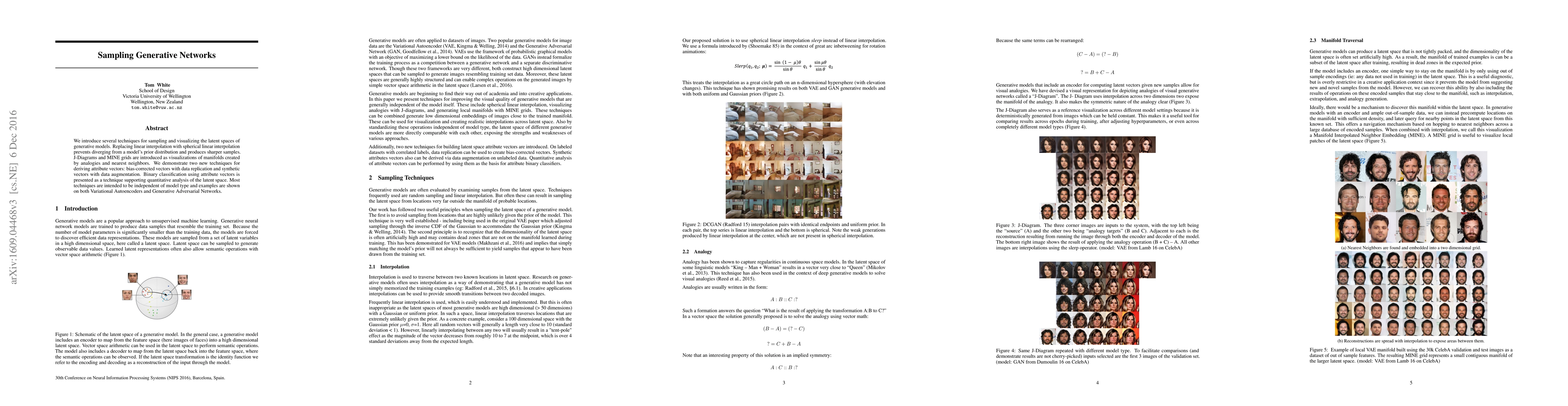 This paper presents techniques for sampling and visualizing the latent spaces of generative models, including spherical linear interpolation for sharper samples and J-Diagrams and MINE grids for manifold visualization. It also introduces methods for deriving attribute vectors and uses binary classification to analyze the latent space, demonstrating applicability across Variational Autoencoders and Generative Adversarial Networks.