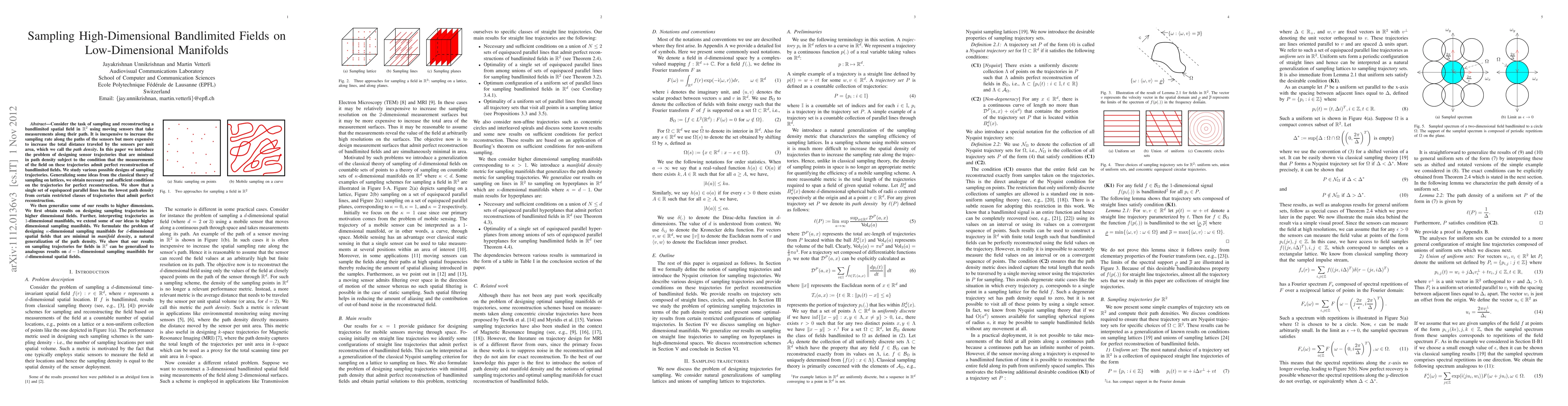 Consider the task of sampling and reconstructing a bandlimited spatial field in $\Re^2$ using moving sensors that take measurements along their path. It is inexpensive to increase the sampling rate along the paths of the sensors but more expensive to increase the total distance traveled by the sensors per unit area, which we call the \emph{path density}. In this paper we introduce the problem of designing sensor trajectories that are minimal in path density subject to the condition that the measurements of the field on these trajectories admit perfect reconstruction of bandlimited fields. We study various possible designs of sampling trajectories. Generalizing some ideas from the classical theory of sampling on lattices, we obtain necessary and sufficient conditions on the trajectories for perfect reconstruction. We show that a single set of equispaced parallel lines has the lowest path density from certain restricted classes of trajectories that admit perfect reconstruction. We then generalize some of our results to higher dimensions. We first obtain results on designing sampling trajectories in higher dimensional fields. Further, interpreting trajectories as 1-dimensional manifolds, we extend some of our ideas to higher dimensional sampling manifolds. We formulate the problem of designing $\kappa$-dimensional sampling manifolds for $d$-dimensional spatial fields that are minimal in \emph{manifold density}, a natural generalization of the path density. We show that our results on sampling trajectories for fields in $\Re^2$ can be generalized to analogous results on $d-1$-dimensional sampling manifolds for $d$-dimensional spatial fields.
