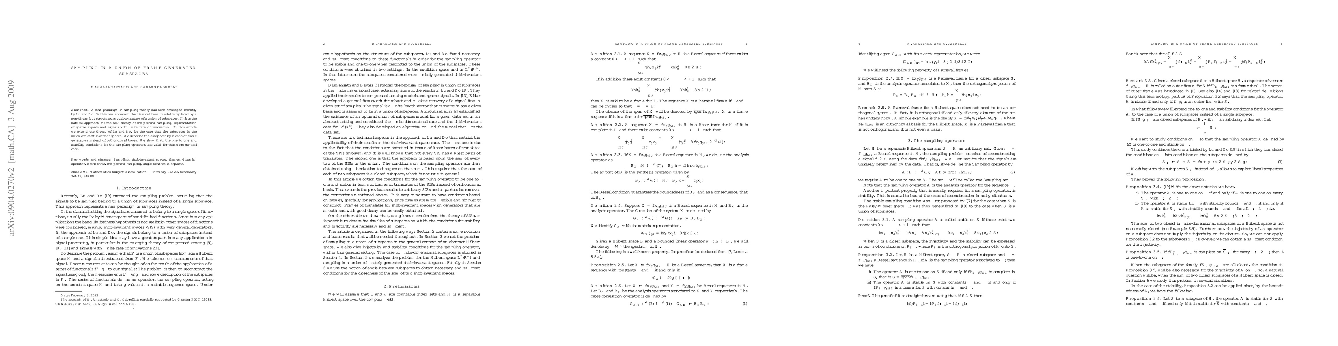A new paradigm in Sampling theory has been developed recently by Lu and Do. In this new approach the classical linear model is replaced by a non-linear, but structured model consisting of a union of subspaces. This is the natural approach for the new theory of compressed sampling, representation of sparse signals and signals with finite rate of innovation. In this article we extend the theory of Lu and Do, for the case that the subspaces in the union are shift-invariant spaces. We describe the subspaces by means of frame generators instead of orthonormal bases. We show that, the one to one and stability conditions for the sampling operator, are valid for this more general case.