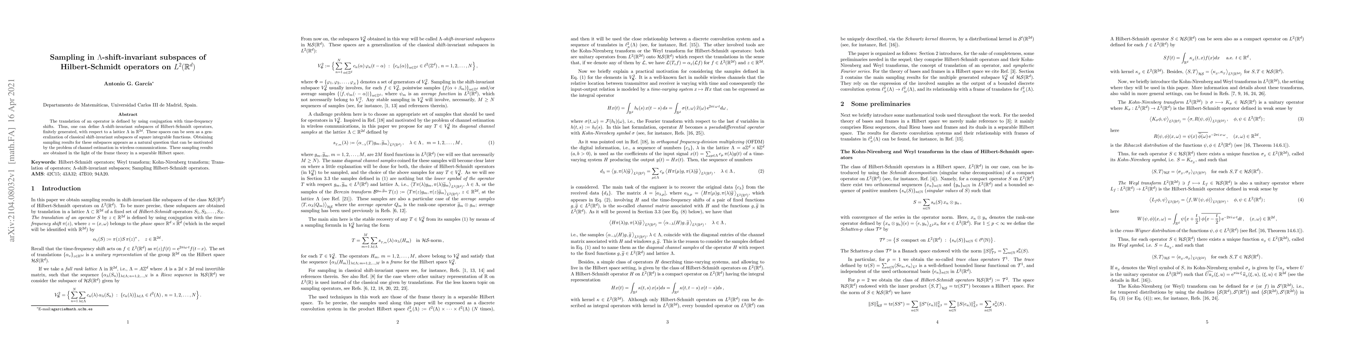 This paper explores $\Lambda$-shift-invariant subspaces of Hilbert-Schmidt operators on $L^2(\mathbb{R}^d)$, generalizing classical shift-invariant subspaces, and derives sampling results motivated by channel estimation in wireless communications, utilizing frame theory in separable Hilbert spaces.