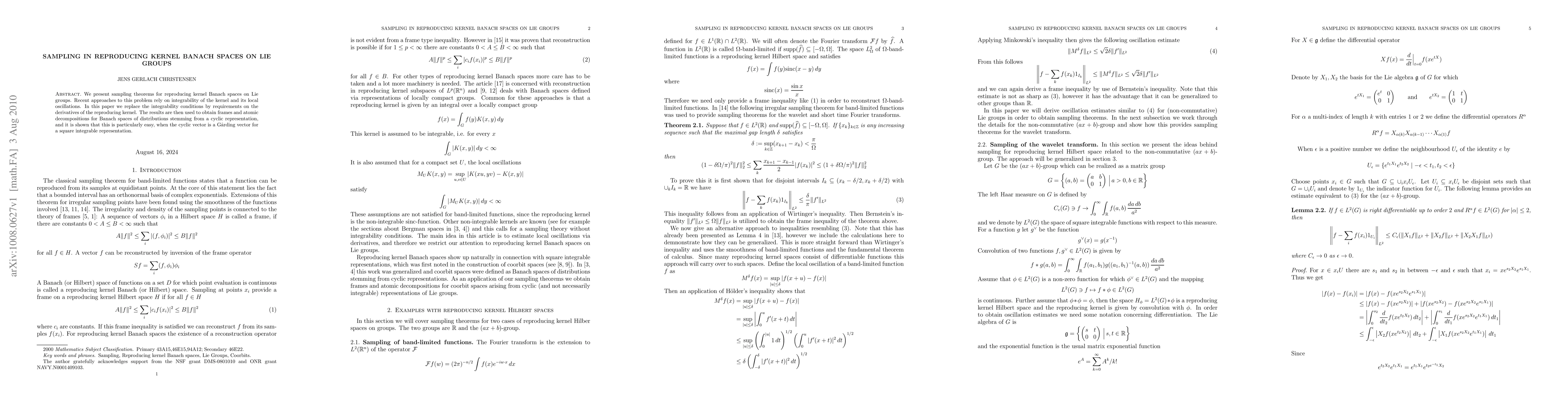 We present sampling theorems for reproducing kernel Banach spaces on Lie groups. Recent approaches to this problem rely on integrability of the kernel and its local oscillations. In this paper we replace the integrability conditions by requirements on the derivatives of the reproducing kernel. The results are then used to obtain frames and atomic decompositions for Banach spaces of distributions stemming from a cyclic representation, and it is shown that this is particularly easy, when the cyclic vector is a G{\aa}rding vector for a square integrable representation.