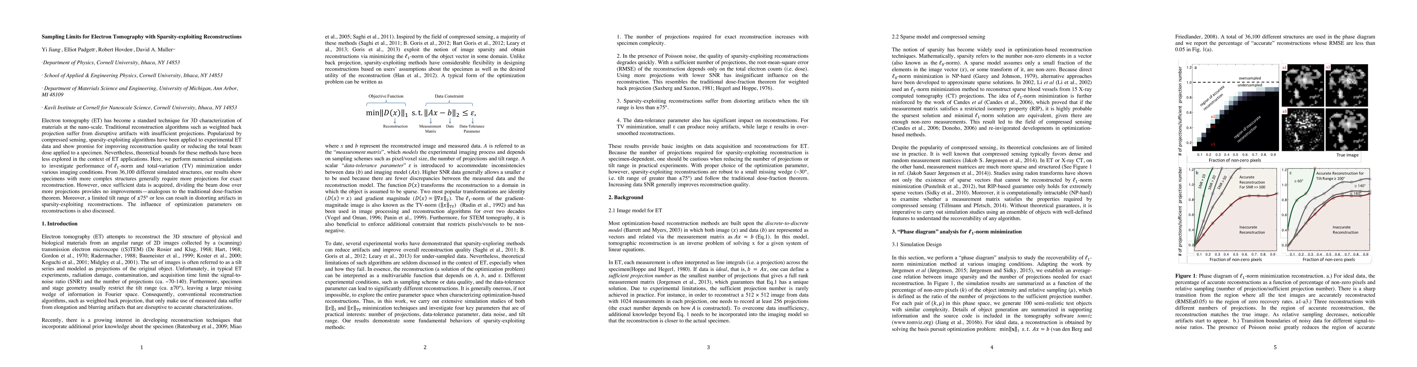 Electron tomography (ET) has become a standard technique for 3D characterization of materials at the nano-scale. Traditional reconstruction algorithms such as weighted back projection suffer from disruptive artifacts with insufficient projections. Popularized by compressed sensing, sparsity-exploiting algorithms have been applied to experimental ET data and show promise for improving reconstruction quality or reducing the total beam dose applied to a specimen. Nevertheless, theoretical bounds for these methods have been less explored in the context of ET applications. Here, we perform numerical simulations to investigate performance of l_1-norm and total-variation (TV) minimization under various imaging conditions. From 36,100 different simulated structures, our results show specimens with more complex structures generally require more projections for exact reconstruction. However, once sufficient data is acquired, dividing the beam dose over more projections provides no improvements - analogous to the traditional dose-fraction theorem. Moreover, a limited tilt range of +-75 or less can result in distorting artifacts in sparsity-exploiting reconstructions. The influence of optimization parameters on reconstructions is also discussed.