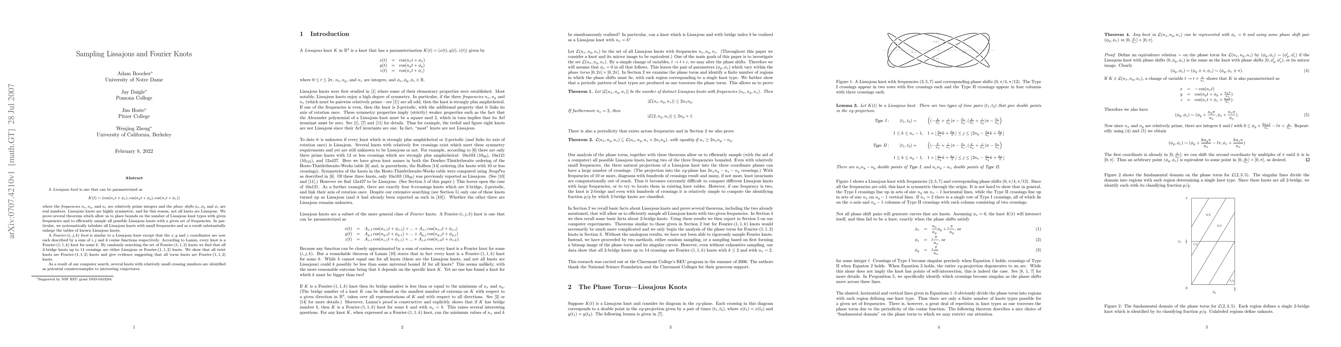 This paper explores Lissajous knots, which can be parameterized by single cosine functions, and proves theorems to bound their types and sample them efficiently. It also investigates Fourier knots, showing that many 2-bridge knots and all twist knots fit this category, and identifies potential counterexamples to conjectures through computational searches.
