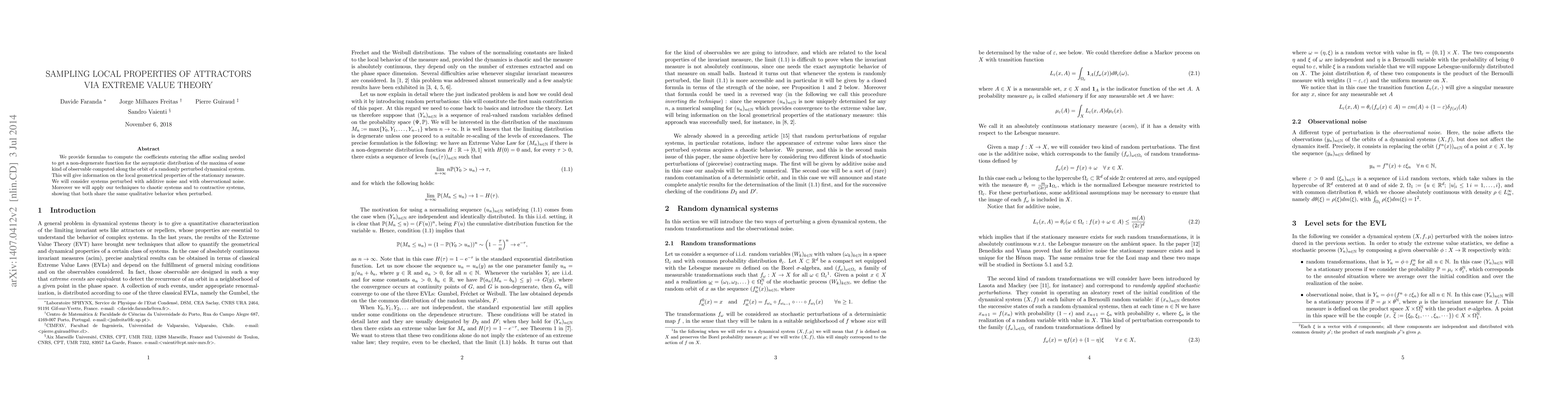 We provide formulas to compute the coefficients entering the affine scaling needed to get a non-degenerate function for the asymptotic distribution of the maxima of some kind of observable computed along the orbit of a randomly perturbed dynamical system. This will give information on the local geometrical properties of the stationary measure. We will consider systems perturbed with additive noise and with observational noise. Moreover we will apply our techniques to chaotic systems and to contractive systems, showing that both share the same qualitative behavior when perturbed.