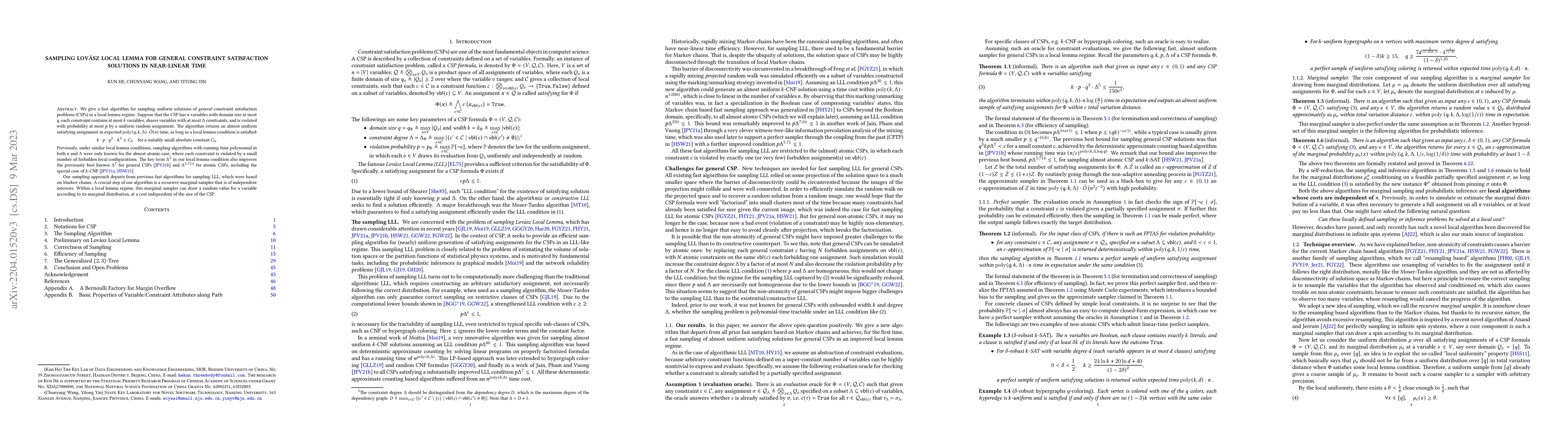 This paper presents an efficient algorithm for sampling uniform solutions of general constraint satisfaction problems (CSPs) under a local lemma condition, achieving near-linear time complexity. The algorithm improves previous bounds on the dependency on the number of shared constraints, reducing it from $\Delta^7$ to $\Delta^5$.