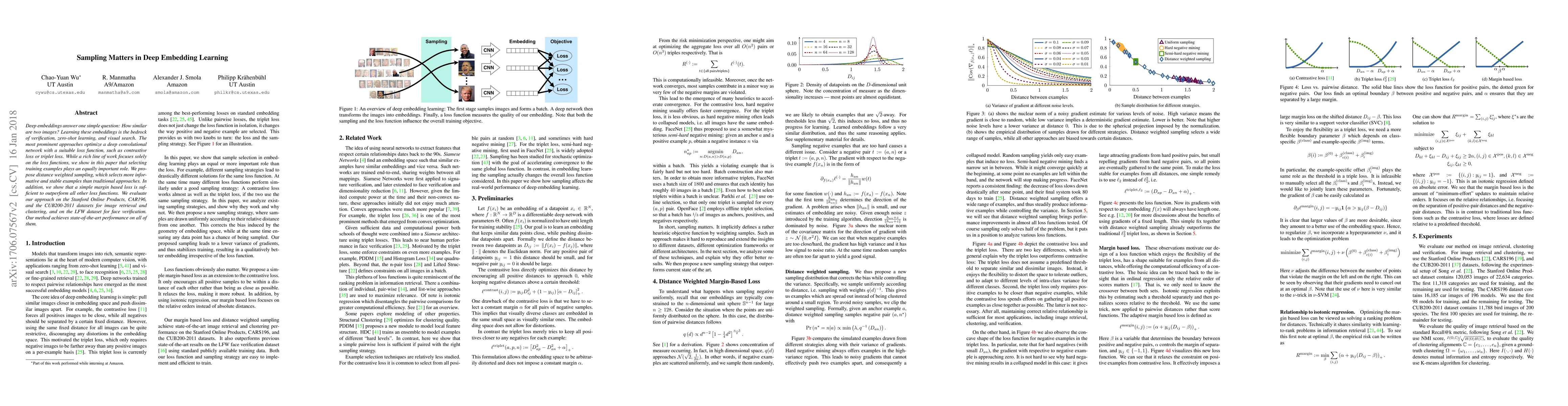 Deep embeddings answer one simple question: How similar are two images? Learning these embeddings is the bedrock of verification, zero-shot learning, and visual search. The most prominent approaches optimize a deep convolutional network with a suitable loss function, such as contrastive loss or triplet loss. While a rich line of work focuses solely on the loss functions, we show in this paper that selecting training examples plays an equally important role. We propose distance weighted sampling, which selects more informative and stable examples than traditional approaches. In addition, we show that a simple margin based loss is sufficient to outperform all other loss functions. We evaluate our approach on the Stanford Online Products, CAR196, and the CUB200-2011 datasets for image retrieval and clustering, and on the LFW dataset for face verification. Our method achieves state-of-the-art performance on all of them.