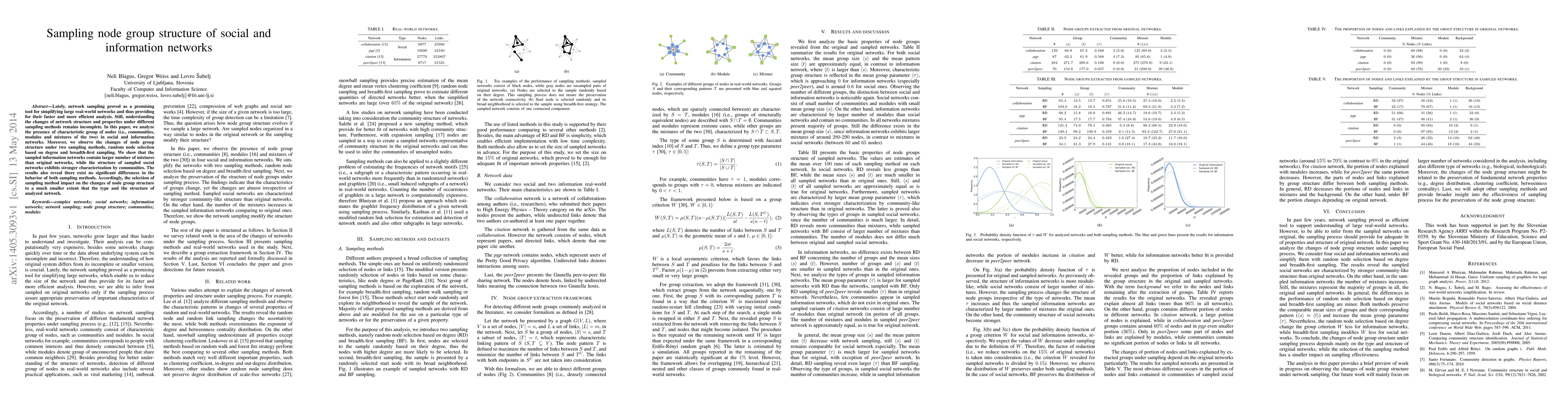 This paper examines how different sampling methods affect the node group structure in social and information networks, finding that degree-based and breadth-first sampling methods show no significant differences. It reveals that sampled information networks have more mixtures, while sampled social networks exhibit stronger community characteristics.