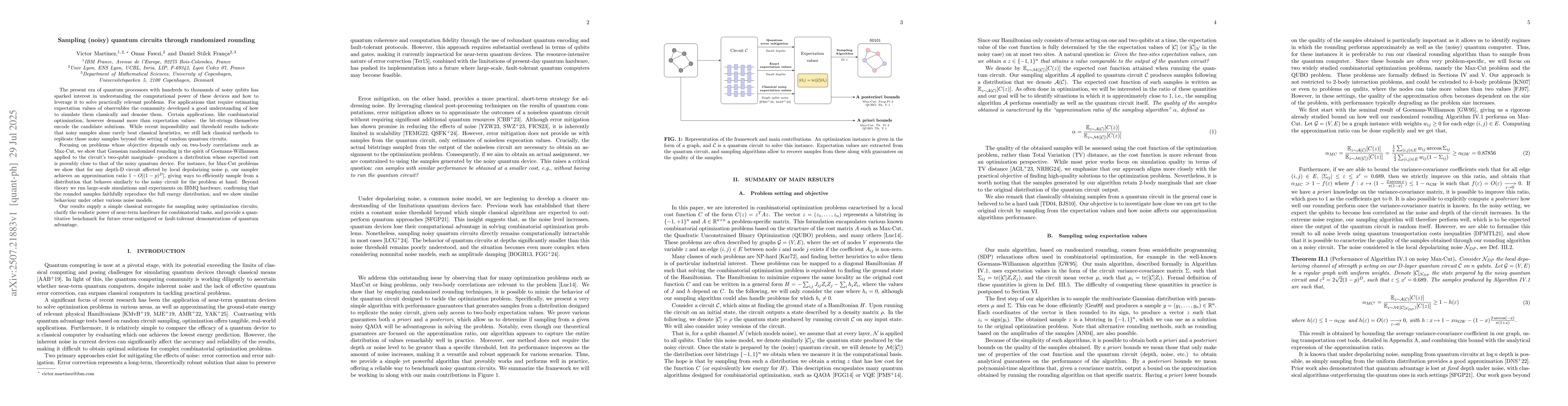 The present era of quantum processors with hundreds to thousands of noisy qubits has sparked interest in understanding the computational power of these devices and how to leverage it to solve practically relevant problems. For applications that require estimating expectation values of observables the community developed a good understanding of how to simulate them classically and denoise them. Certain applications, like combinatorial optimization, however demand more than expectation values: the bit-strings themselves encode the candidate solutions. While recent impossibility and threshold results indicate that noisy samples alone rarely beat classical heuristics, we still lack classical methods to replicate those noisy samples beyond the setting of random quantum circuits. Focusing on problems whose objective depends only on two-body correlations such as Max-Cut, we show that Gaussian randomized rounding in the spirit of Goemans-Williamson applied to the circuit's two-qubit marginals-produces a distribution whose expected cost is provably close to that of the noisy quantum device. For instance, for Max-Cut problems we show that for any depth-D circuit affected by local depolarizing noise p, our sampler achieves an approximation ratio $1-O[(1-p)^D]$, giving ways to efficiently sample from a distribution that behaves similarly to the noisy circuit for the problem at hand. Beyond theory we run large-scale simulations and experiments on IBMQ hardware, confirming that the rounded samples faithfully reproduce the full energy distribution, and we show similar behaviour under other various noise models. Our results supply a simple classical surrogate for sampling noisy optimization circuits, clarify the realistic power of near-term hardware for combinatorial tasks, and provide a quantitative benchmark for future error-mitigated or fault-tolerant demonstrations of quantum advantage.