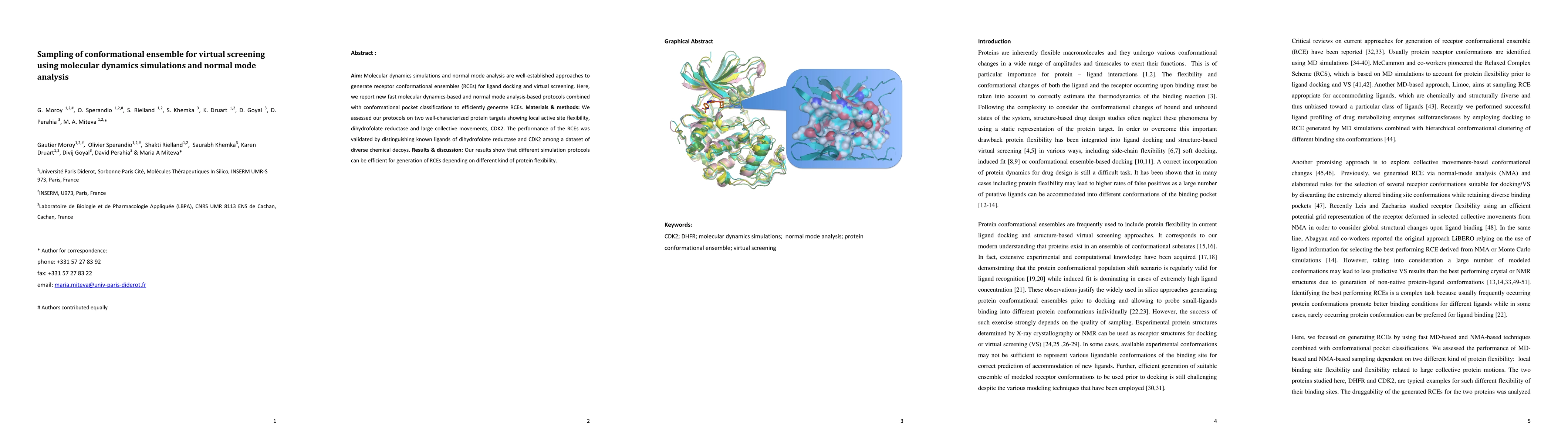This paper presents new protocols combining fast molecular dynamics simulations and normal mode analysis for generating receptor conformational ensembles (RCEs) to enhance virtual screening. The effectiveness of these protocols was validated on two protein targets, demonstrating their ability to distinguish known ligands from decoys based on different types of protein flexibility.