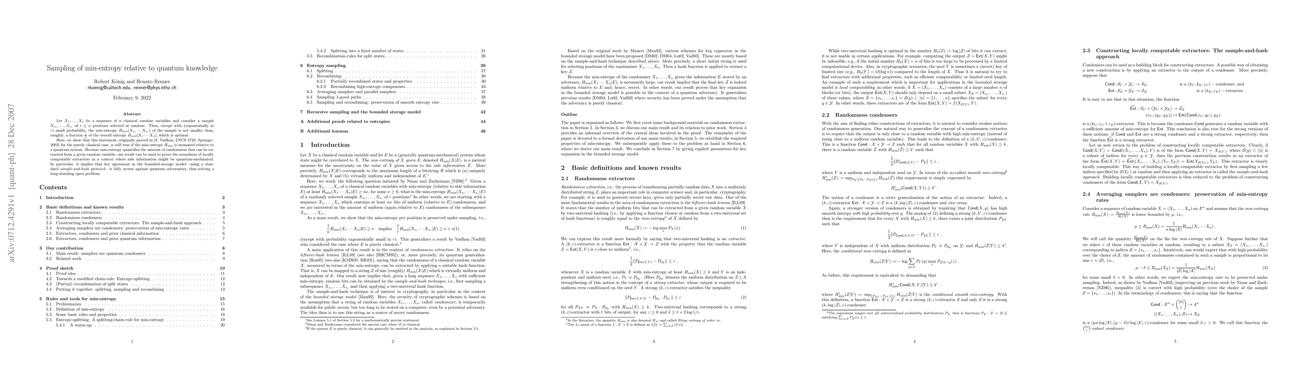 Let X_1, ..., X_n be a sequence of n classical random variables and consider a sample of r positions selected at random. Then, except with (exponentially in r) small probability, the min-entropy of the sample is not smaller than, roughly, a fraction r/n of the total min-entropy of all positions X_1, ..., X_n, which is optimal. Here, we show that this statement, originally proven by Vadhan [LNCS, vol. 2729, Springer, 2003] for the purely classical case, is still true if the min-entropy is measured relative to a quantum system. Because min-entropy quantifies the amount of randomness that can be extracted from a given random variable, our result can be used to prove the soundness of locally computable extractors in a context where side information might be quantum-mechanical. In particular, it implies that key agreement in the bounded-storage model (using a standard sample-and-hash protocol) is fully secure against quantum adversaries, thus solving a long-standing open problem.