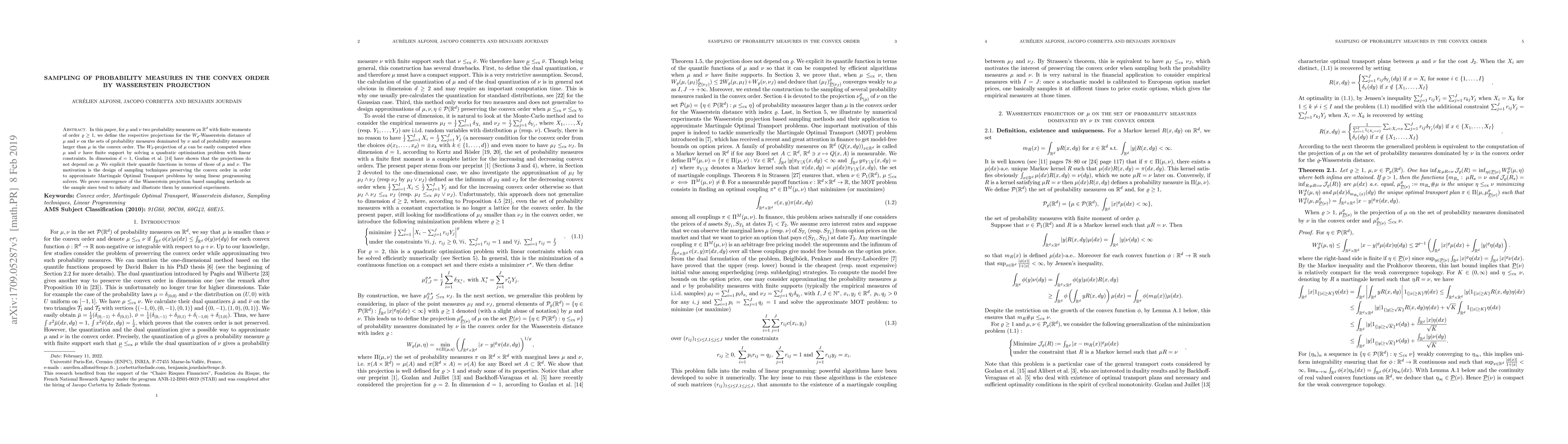 In this paper, for $\mu$ and $\nu$ two probability measures on $\mathbb{R}^d$ with finite moments of order $\rho\ge 1$, we define the respective projections for the $W_\rho$-Wasserstein distance of $\mu$ and $\nu$ on the sets of probability measures dominated by $\nu$ and of probability measures larger than $\mu$ in the convex order. The $W_2$-projection of $\mu$ can be easily computed when $\mu$ and $\nu$ have finite support by solving a quadratic optimization problem with linear constraints. In dimension $d=1$, Gozlan et al.~(2018) have shown that the projections do not depend on $\rho$. We explicit their quantile functions in terms of those of $\mu$ and $\nu$. The motivation is the design of sampling techniques preserving the convex order in order to approximate Martingale Optimal Transport problems by using linear programming solvers. We prove convergence of the Wasserstein projection based sampling methods as the sample sizes tend to infinity and illustrate them by numerical experiments.