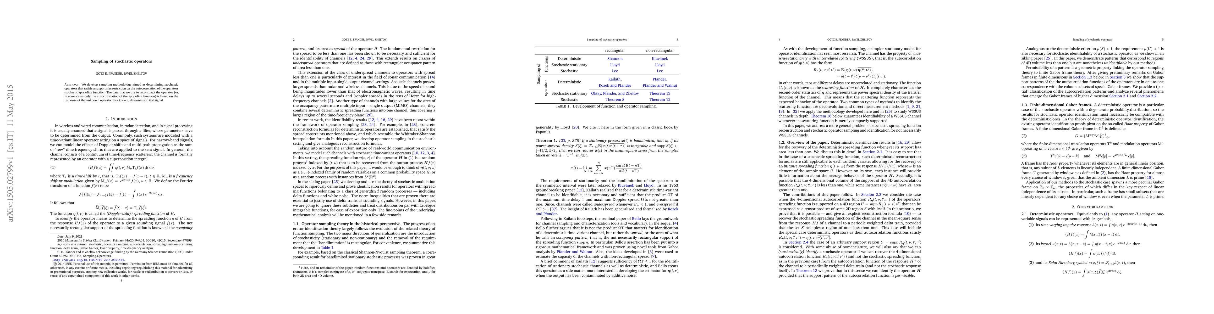 We develop sampling methodology aimed at determining stochastic operators that satisfy a support size restriction on the autocorrelation of the operators stochastic spreading function. The data that we use to reconstruct the operator (or, in some cases only the autocorrelation of the spreading function) is based on the response of the unknown operator to a known, deterministic test signal.