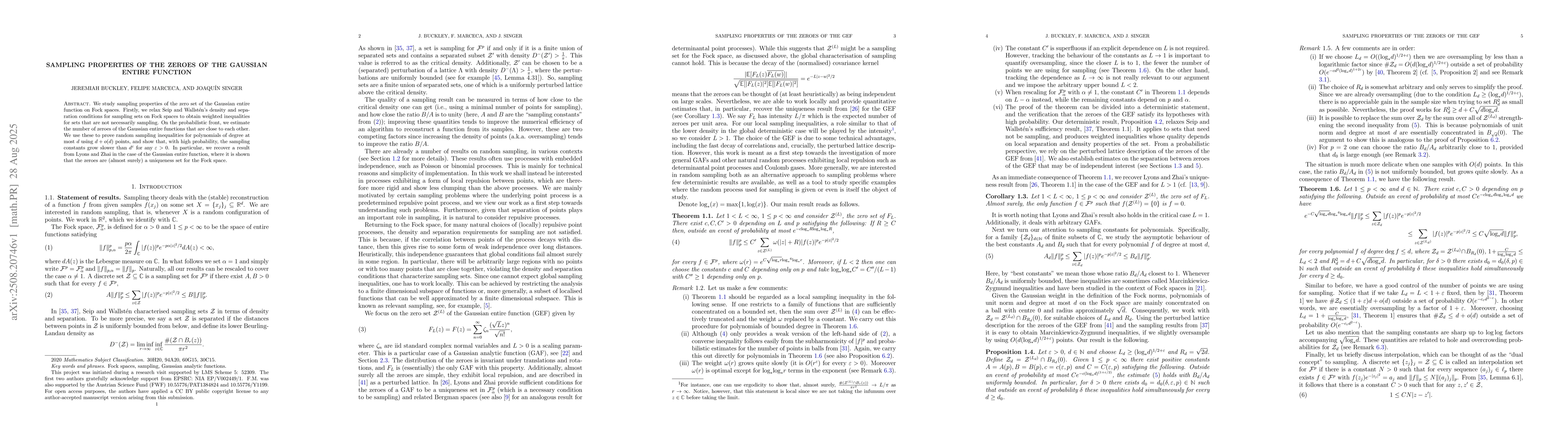 We study sampling properties of the zero set of the Gaussian entire function on Fock spaces. Firstly, we relax Seip and Wallst\'en's density and separation conditions for sampling sets on Fock spaces to obtain weighted inequalities for sets that are not necessarily sampling. On the probabilistic front, we estimate the number of zeroes of the Gaussian entire functions that are close to each other. We use these to prove random sampling inequalities for polynomials of degree at most $d$ using ${d}+o(d)$ points, and show that, with high probability, the sampling constants grow slower than $d^\varepsilon$ for any $\varepsilon>0$. In particular, we recover a result from Lyons and Zhai in the case of the Gaussian entire function, where it is shown that the zeroes are (almost surely) a uniqueness set for the Fock space.