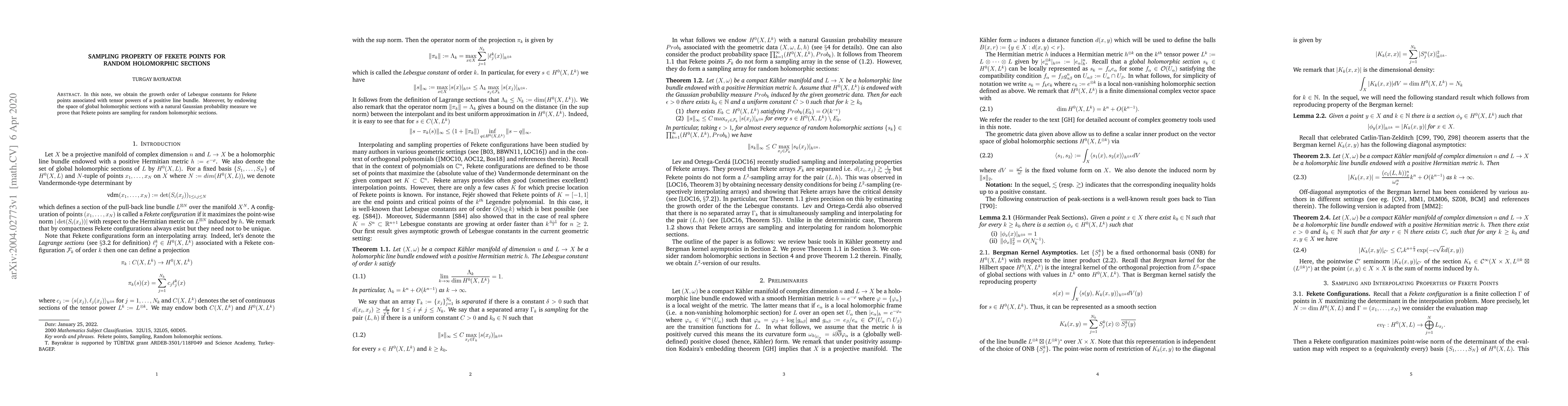 This paper investigates the growth order of Lebesgue constants for Fekete points linked to tensor powers of a positive line bundle and demonstrates that these points are sampling points for random holomorphic sections under a Gaussian probability measure on the space of global holomorphic sections.