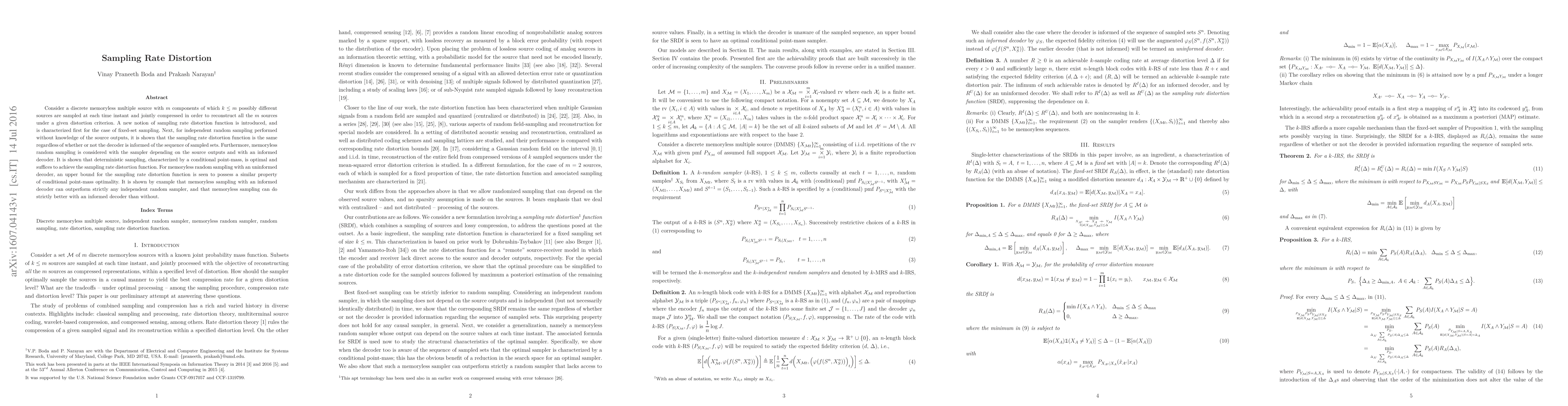 The paper presents a sampling rate distortion theory for centralized sampling of fixed-size subsets of components from a discrete memoryless multiple source, followed by encoding and lossy reconstruction, providing single-letter characterizations for different sampling strategies.