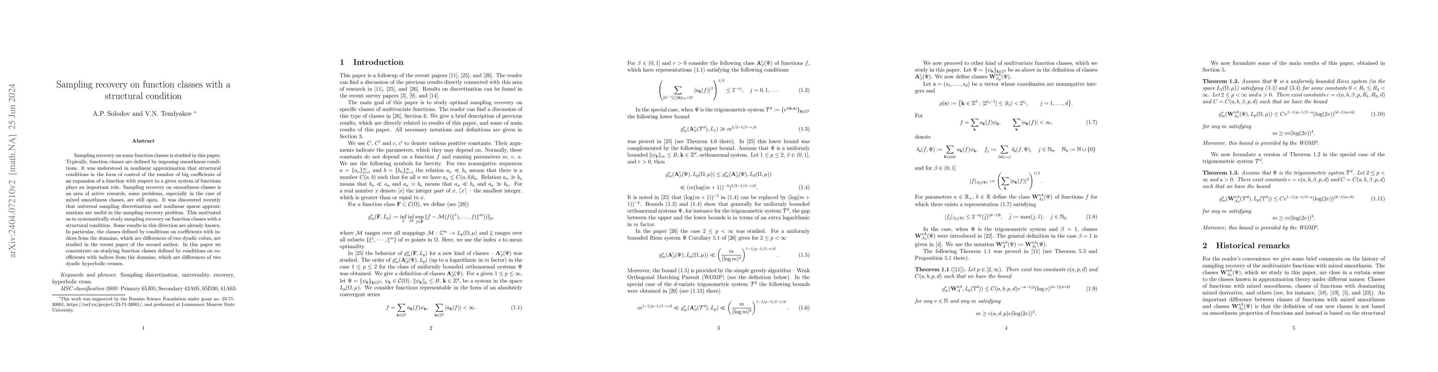 This paper investigates sampling recovery on function classes defined by structural conditions, specifically focusing on domains that are differences of two dyadic hyperbolic crosses. It builds on recent findings about universal sampling discretization and nonlinear sparse approximations to systematically explore these function classes.