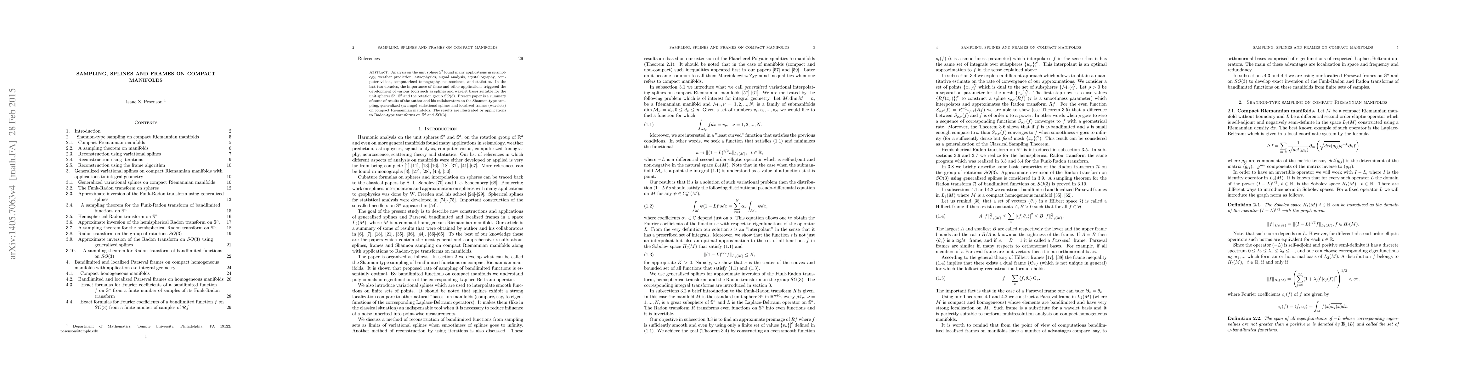 Analysis on the unit sphere $\mathbb{S}^{2}$ found many applications in seismology, weather prediction, astrophysics, signal analysis, crystallography, computer vision, computerized tomography, neuroscience, and statistics. In the last two decades, the importance of these and other applications triggered the development of various tools such as splines and wavelet bases suitable for the unit spheres $\mathbb{S}^{2}$, $\>\>\mathbb{S}^{3}$ and the rotation group $SO(3)$. Present paper is a summary of some of results of the author and his collaborators on the Shannon-type sampling, generalized (average) variational splines and localized frames (wavelets) on compact Riemannian manifolds. The results are illustrated by applications to Radon-type transforms on $\mathbb{S}^{d}$ and $SO(3)$.