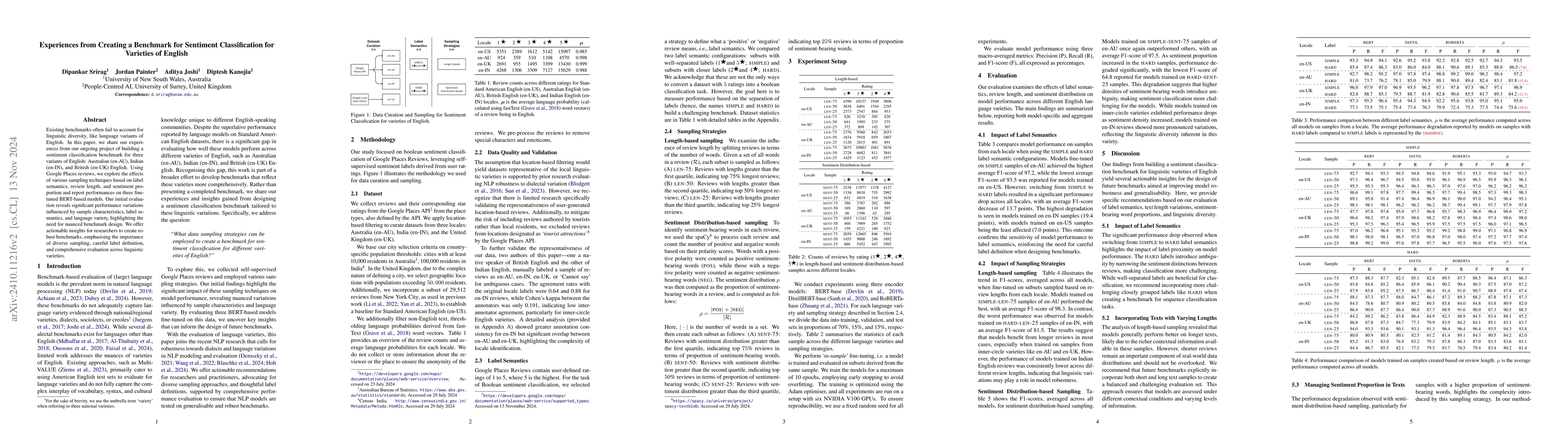 This paper explores sampling strategies to develop a benchmark dataset for dialectal sentiment classification of Google Places reviews in Australian, Indian, and British English, emphasizing the need for diverse benchmarks to address dialectal differences and challenges. Performance is evaluated using fine-tuned BERT models, revealing distinct difficulties with inner-circle and non-native dialects.
