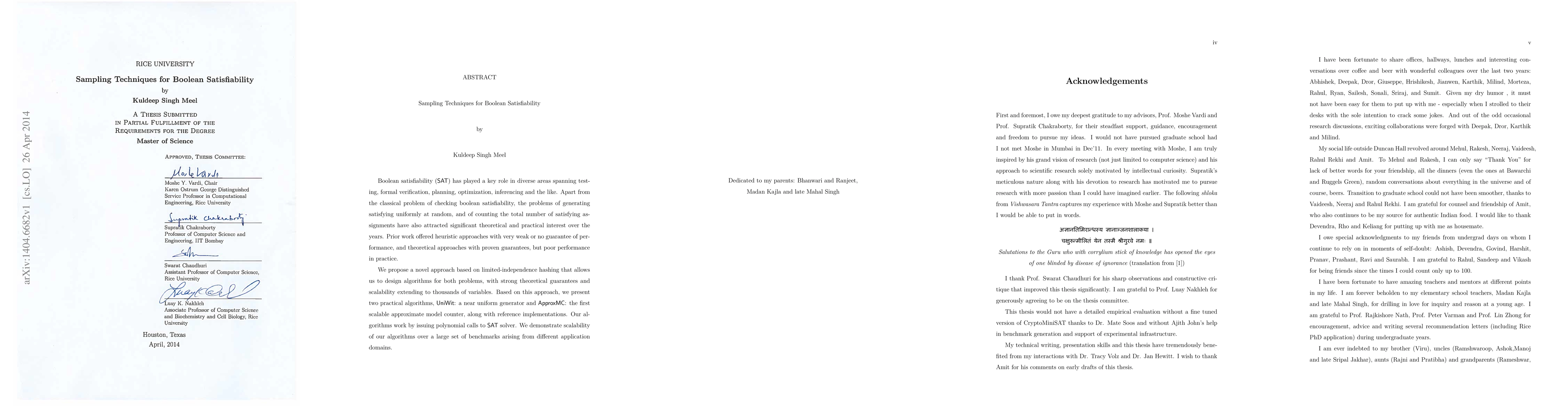 This paper proposes a novel approach using limited-independence hashing to generate uniformly random satisfying assignments and count them efficiently for Boolean satisfiability problems. The proposed algorithms, {\UniformWitness} and {\approxMC}, offer strong theoretical guarantees and practical scalability for large variable sets.