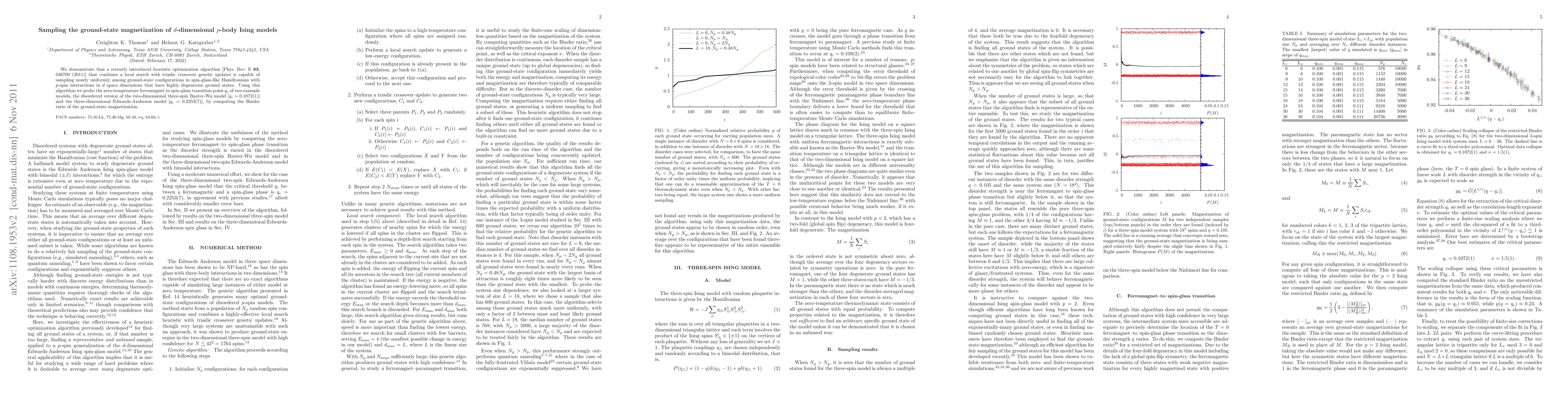 We demonstrate that a recently introduced heuristic optimization algorithm [Phys. Rev. E 83, 046709 (2011)] that combines a local search with triadic crossover genetic updates is capable of sampling nearly uniformly among ground-state configurations in spin-glass-like Hamiltonians with p-spin interactions in d space dimensions that have highly degenerate ground states. Using this algorithm we probe the zero-temperature ferromagnet to spin-glass transition point q_c of two example models, the disordered version of the two-dimensional three-spin Baxter-Wu model [q_c = 0.1072(1)] and the three-dimensional Edwards-Anderson model [q_c = 0.2253(7)], by computing the Binder ratio of the ground-state magnetization.