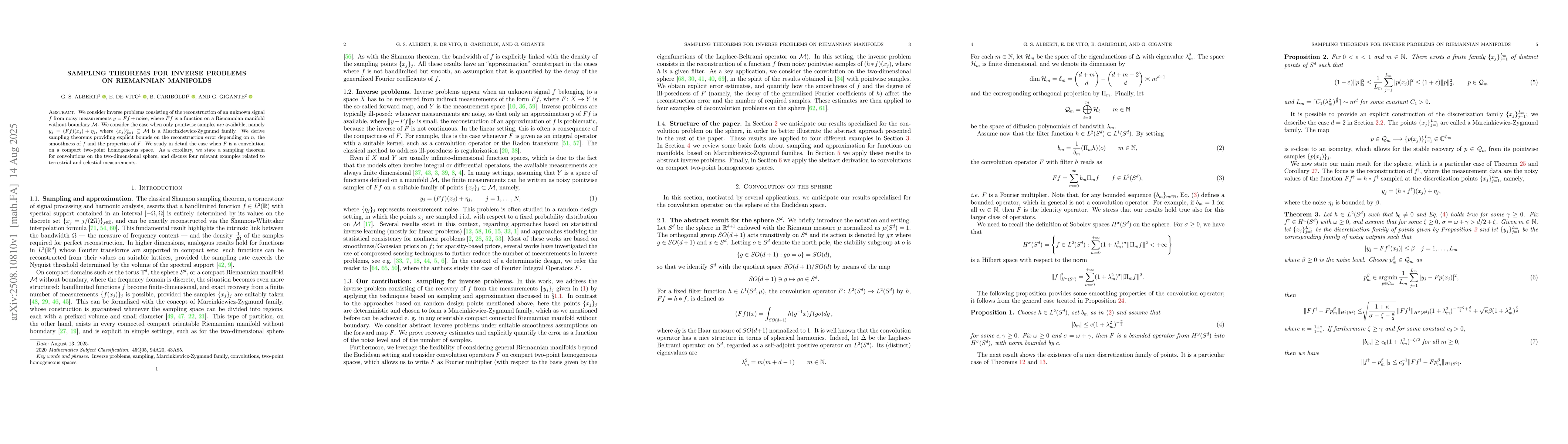 We consider inverse problems consisting of the reconstruction of an unknown signal $f$ from noisy measurements $y=Ff+\text{noise}$, where $Ff$ is a function on a Riemannian manifold without boundary $\mathcal M$. We consider the case when only pointwise samples are available, namely $y_j = (Ff)(x_j)+\eta_j$, where $\{x_j\}_{j=1}^n\subseteq\mathcal M$ is a Marcinkiewicz-Zygmund family. We derive sampling theorems providing explicit bounds on the reconstruction error depending on $n$, the smoothness of $f$ and the properties of $F$. We study in detail the case when $F$ is a convolution on a compact two-point homogeneous space. As a corollary, we state a sampling theorem for convolutions on the two-dimensional sphere, and discuss four relevant examples related to terrestrial and celestial measurements.